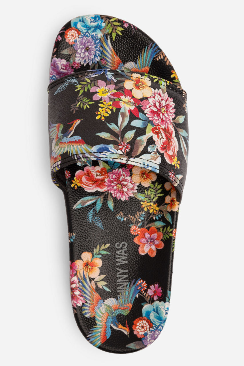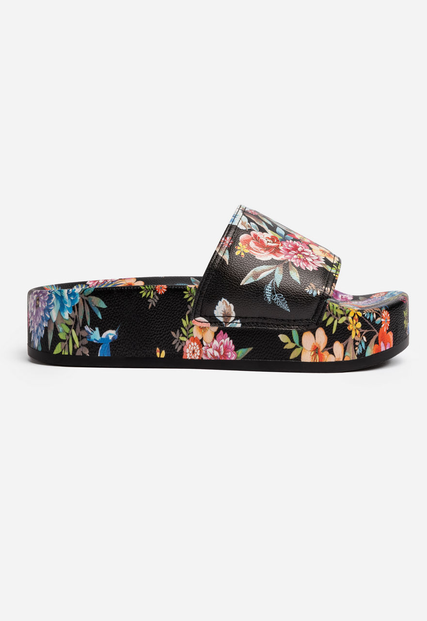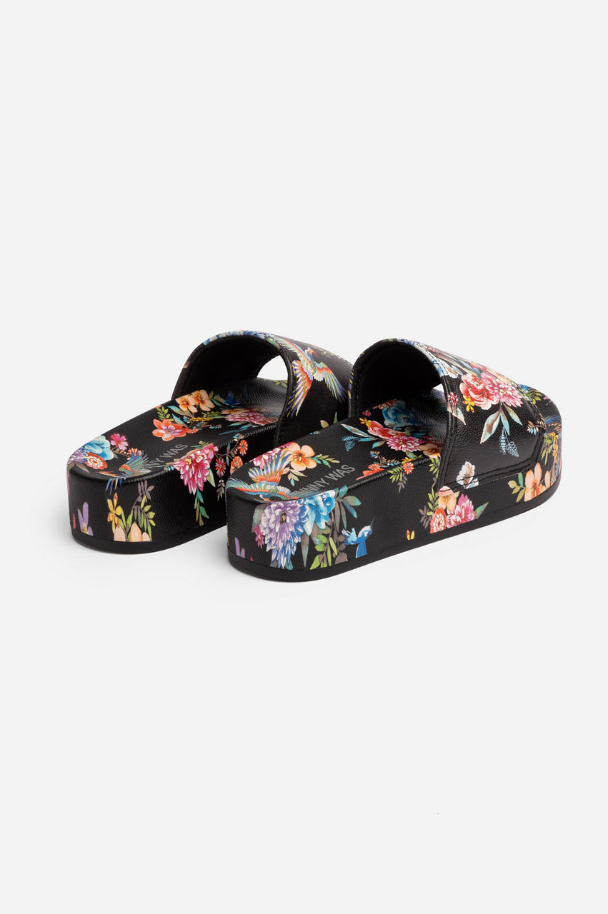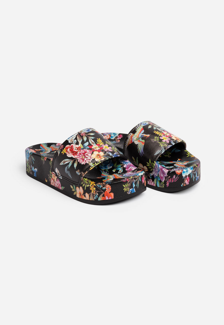 Presenting a polished poolside look, the Dreamer Garden Platform Slides perfectly combine style and functionality. Featuring a wide band across the top for extra comfort, this platform slide is bathed in colorful floral bouquets for a bit of visual interest. Pair with your favorite bold swimwear and a black linen swim cover up for a glamorous resort look.