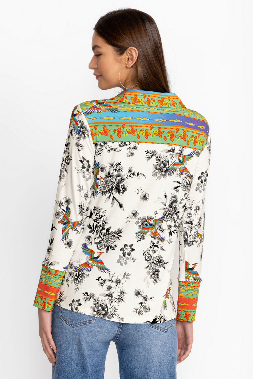 Crafted from a lightweight blend with a hint of stretch, the Dreamer Garden Split Front Henley Tee offers an eclectic mix of color and pattern. Featuring a collared Henley neckline with an ornate border, this patterned top is finished with broad, vibrant cuffs for a splash of color. Pair with black slim fit pants and colorful flats for a polished workday look.