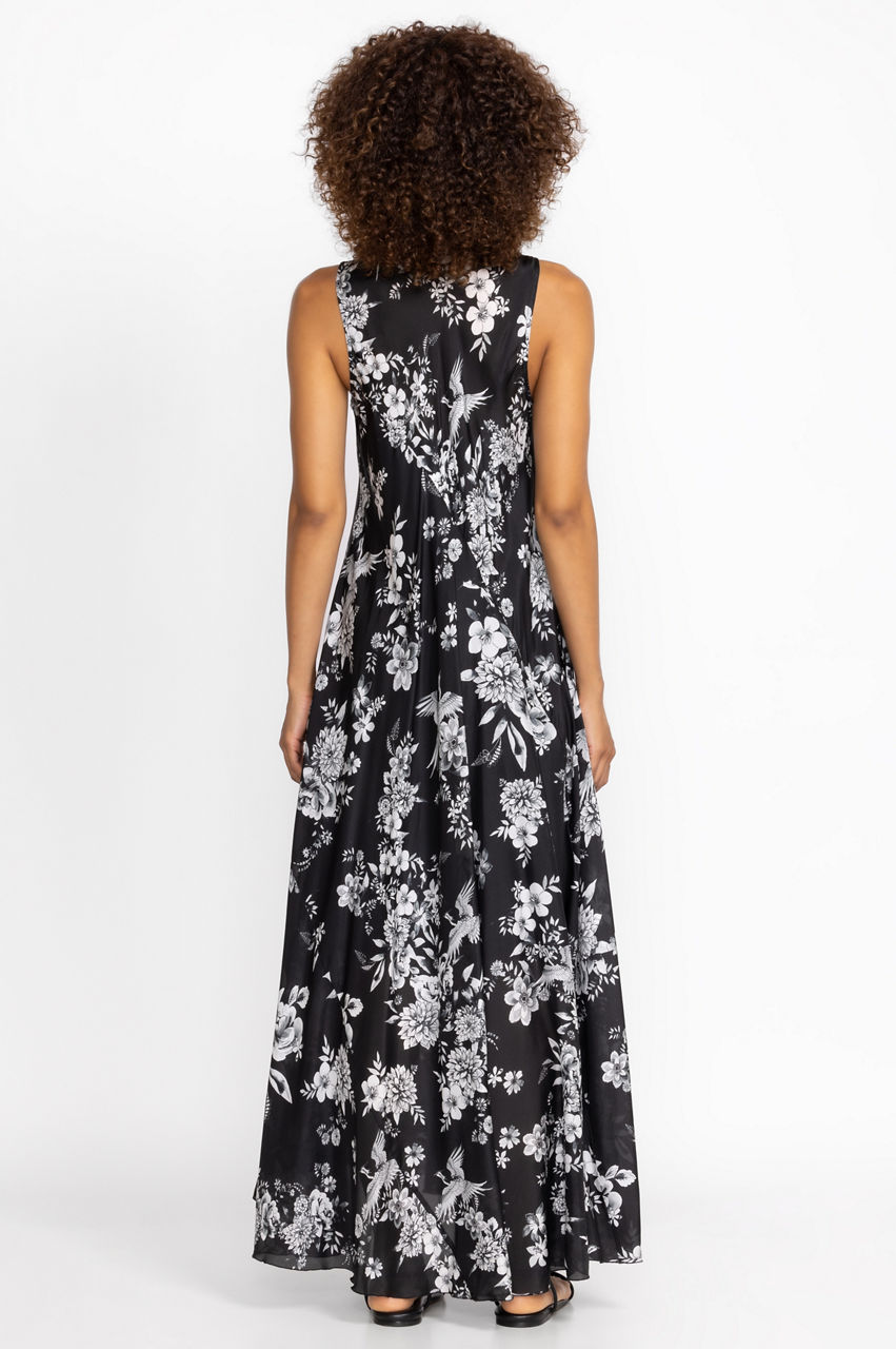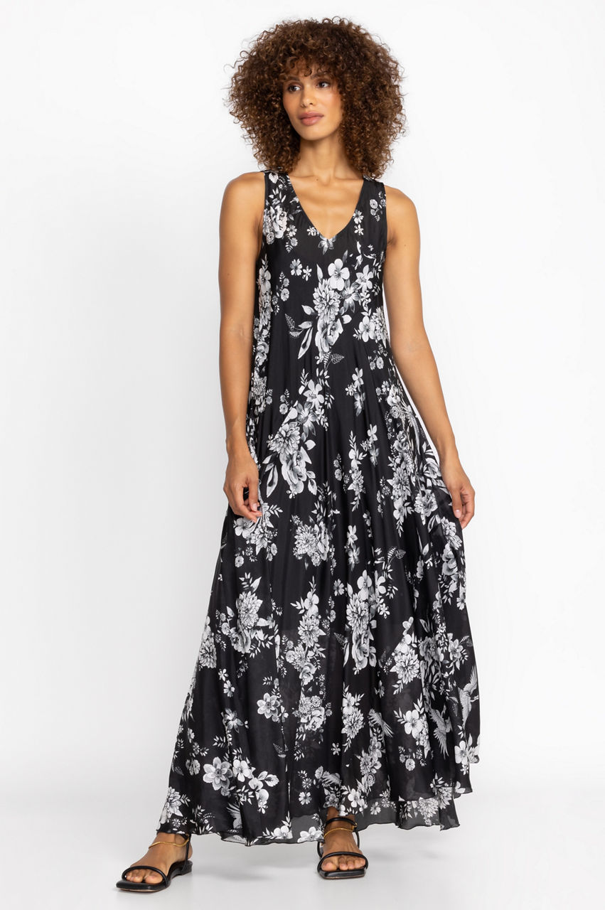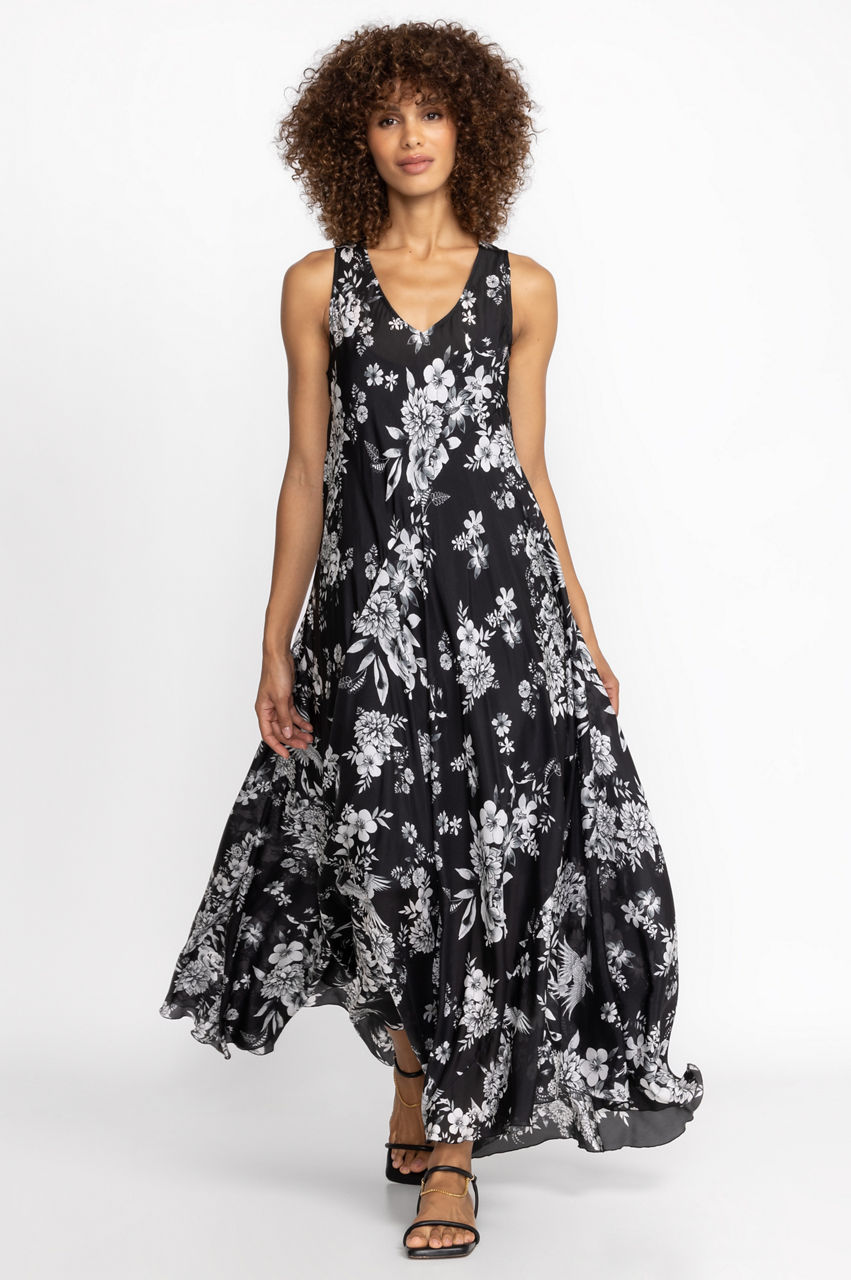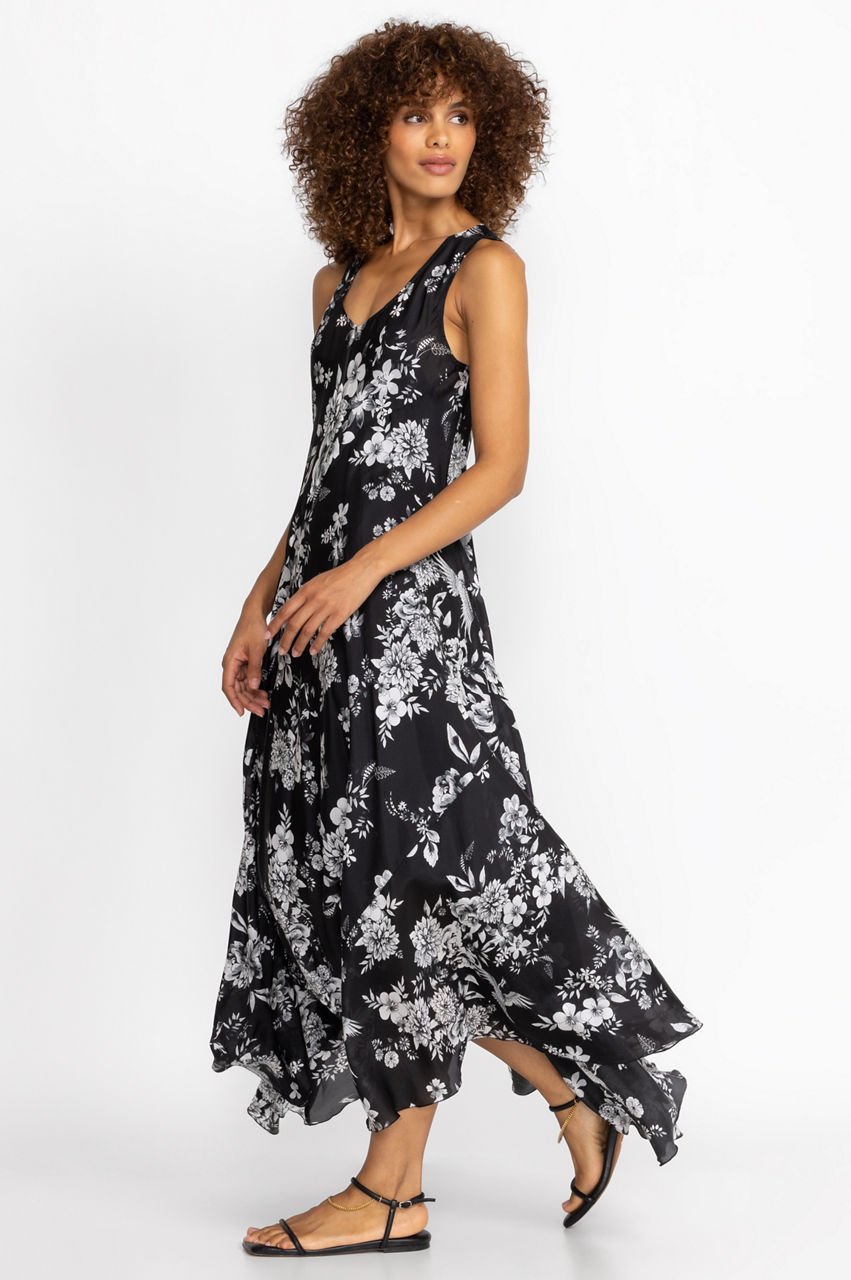 Spun from lustrous silk, the Dreamer Silk Bias Dress conjures images of a quaint floral garden. Falling to a maxi length, this bias-cut dress boasts a V-neck, a white floral pattern, and a separate slip. Style this dress with simple accessories and sandals to the next family gathering or garden party.