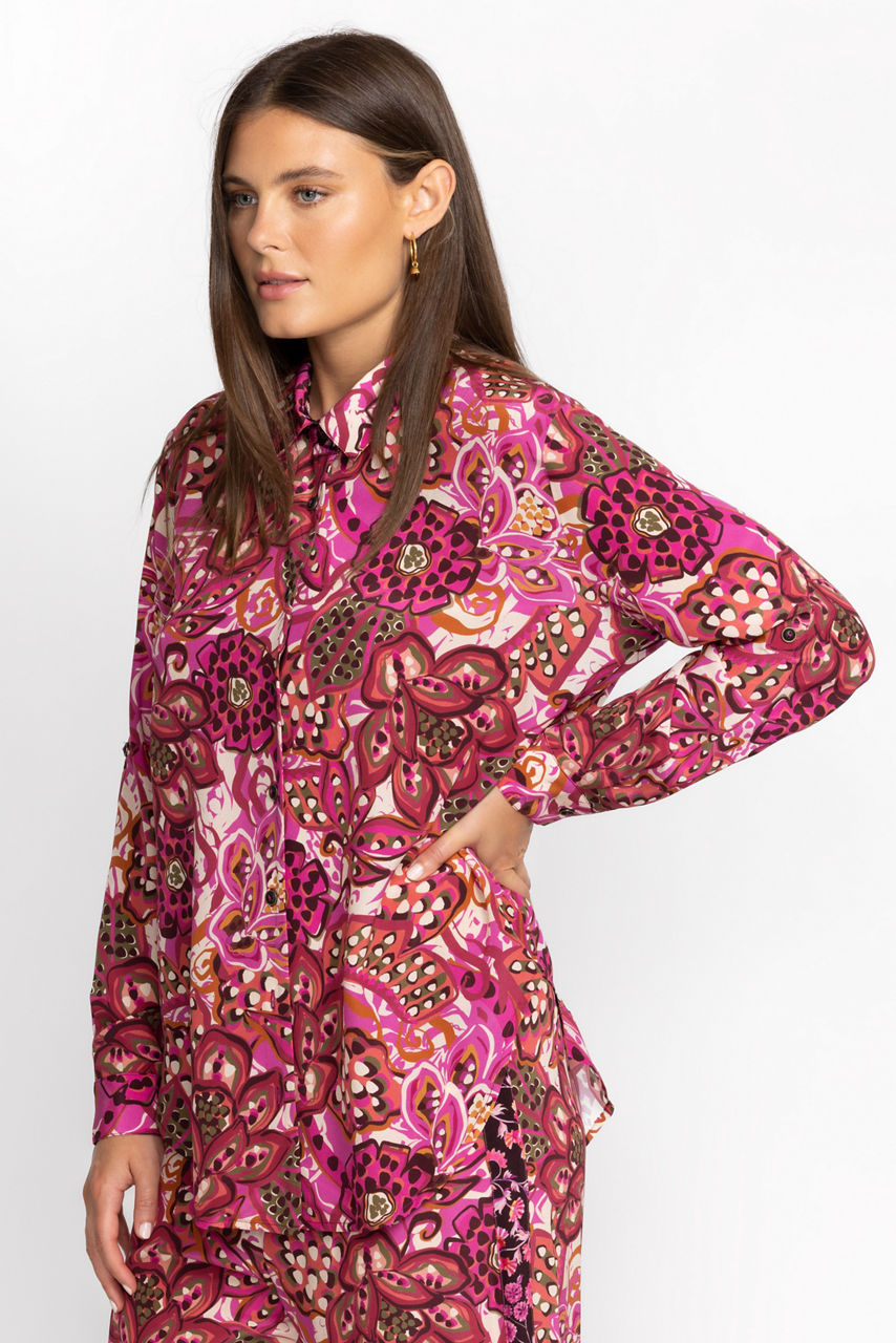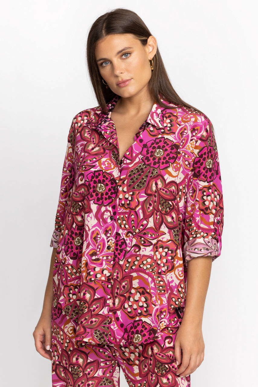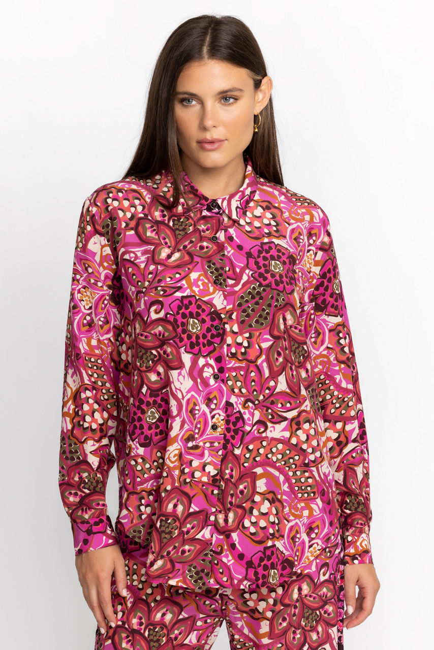 Tinged with a romantic mood, the Dreams of Vivanna Silk Shirt puts an elegant spin on a timeless wardrobe icon. Imagined in a red and pink color scheme, this shirt is designed from sumptuous silk and boasts a classic collar, a front button closure, short sleeves, and a blossoming floral pattern. Wear this shirt with tailored pants and heels for a sophisticated day-to-night ensemble.