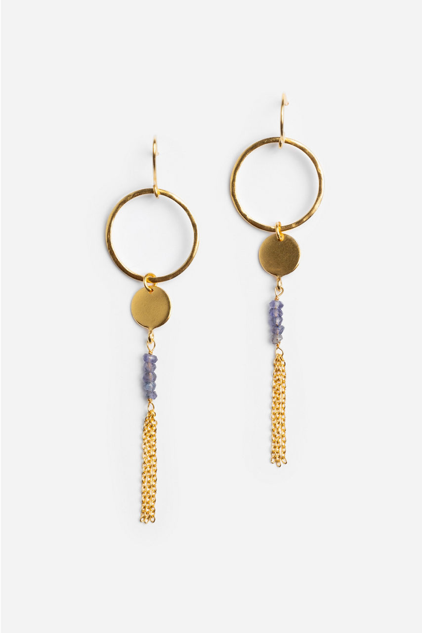 Ethereal and elegant, the Dreamscape Iolite Dangle Earrings feature cascading gold chains, faceted iolite stones, and hammered disc accents for a hint of shimmer and movement. Their lightweight design and dreamy hues make them perfect for day-to-night wear with effortless charm.