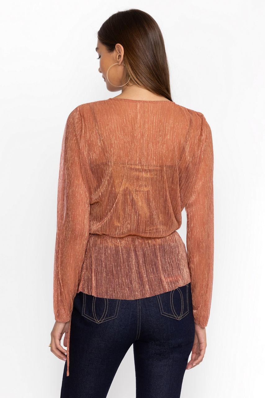 Crafted from a unique metallic blend fabric, the Duffie Wrap Blouse is equal parts delicate and feminine. Featuring a wrap-front and long sleeves, this slip-lined blouse is finished with a delicate tie at the waist. Pair with elegant black palazzo pants and heels for a polished evening look.