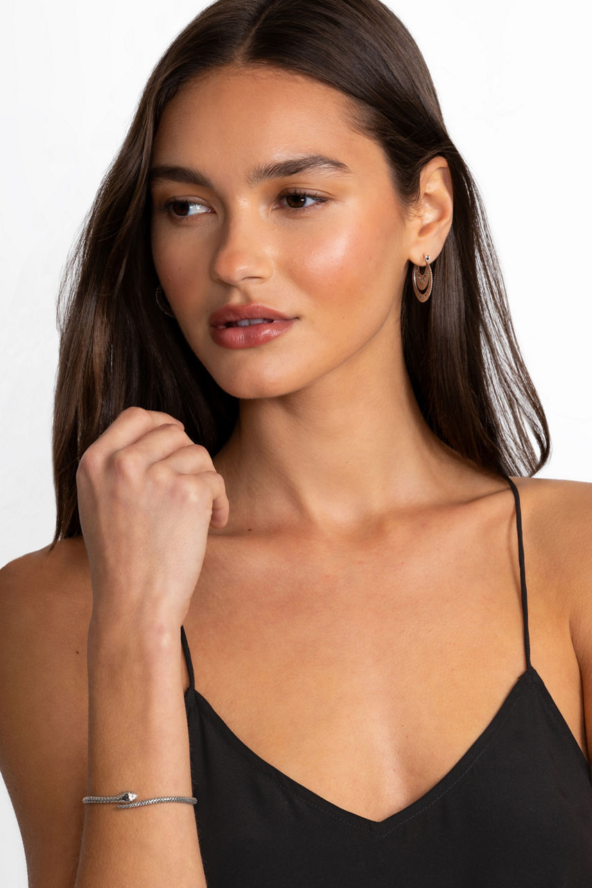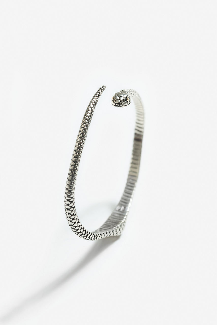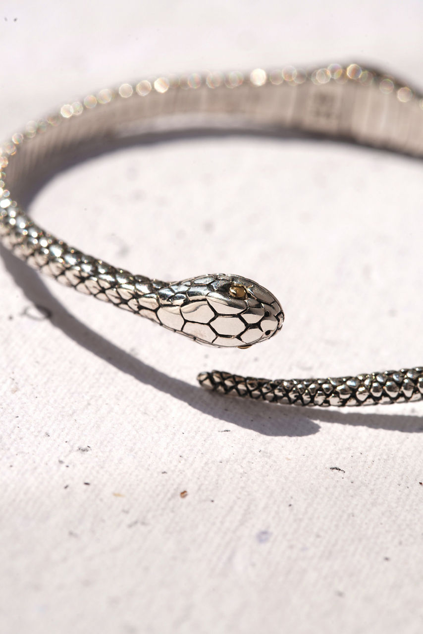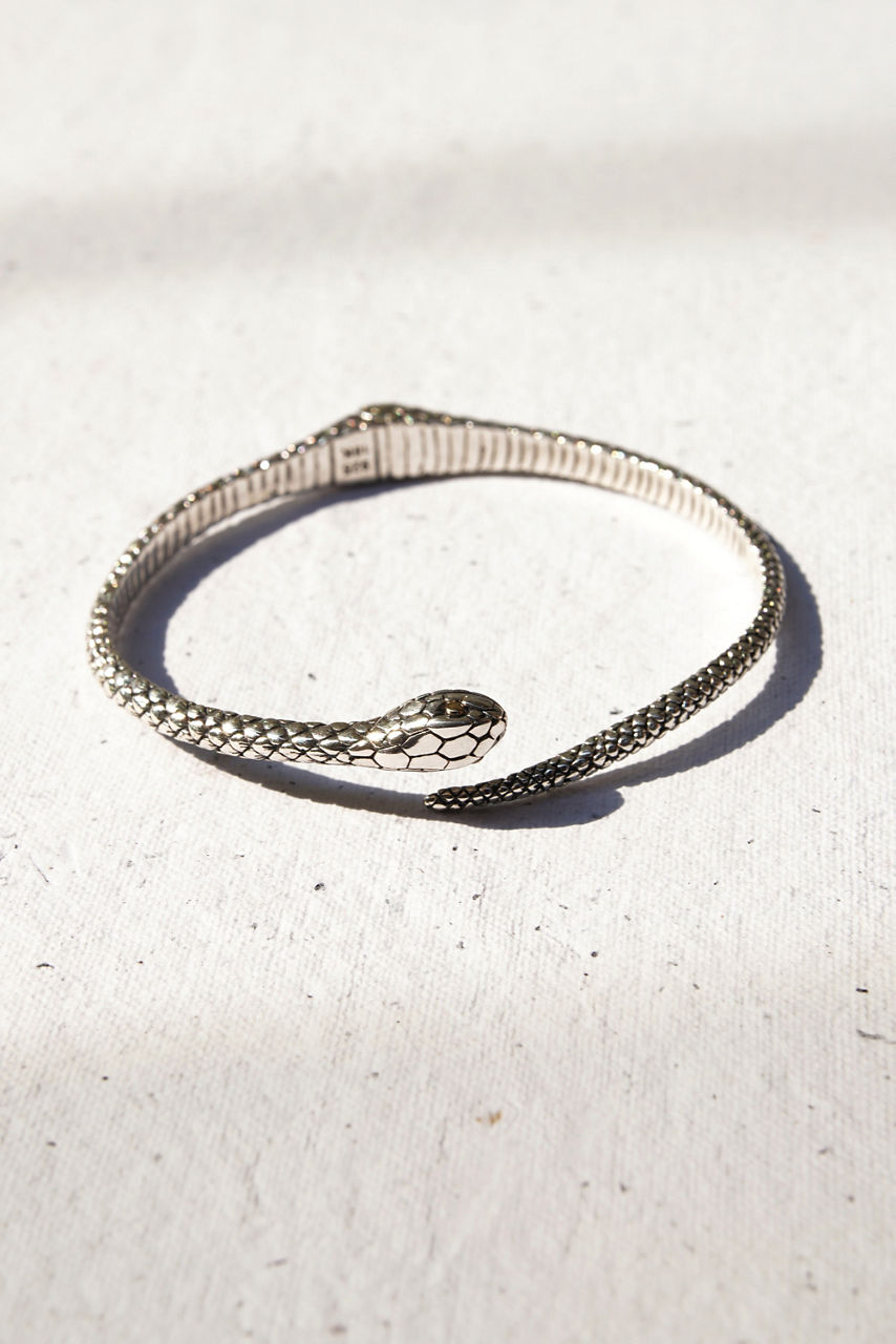 Honoring one of nature's most fascinating creatures, the Earth Serpent Bracelet wraps delicately at the wrist. Handcrafted from sterling silver and accented with gold plating at the eyes, this unique bracelet is designed with a combination of high polish and oxidized finishes to create a textured, realistic look. Layer with beaded bracelets and add to a casual ensemble for an elevated weekend look.