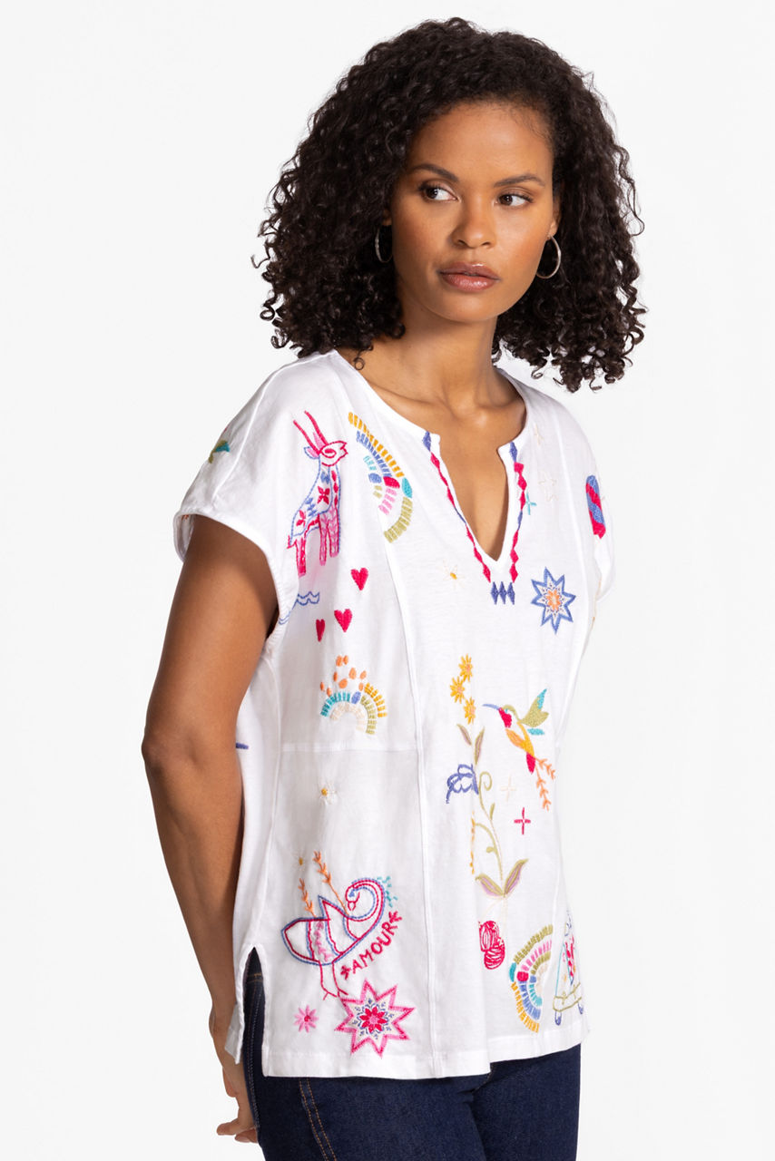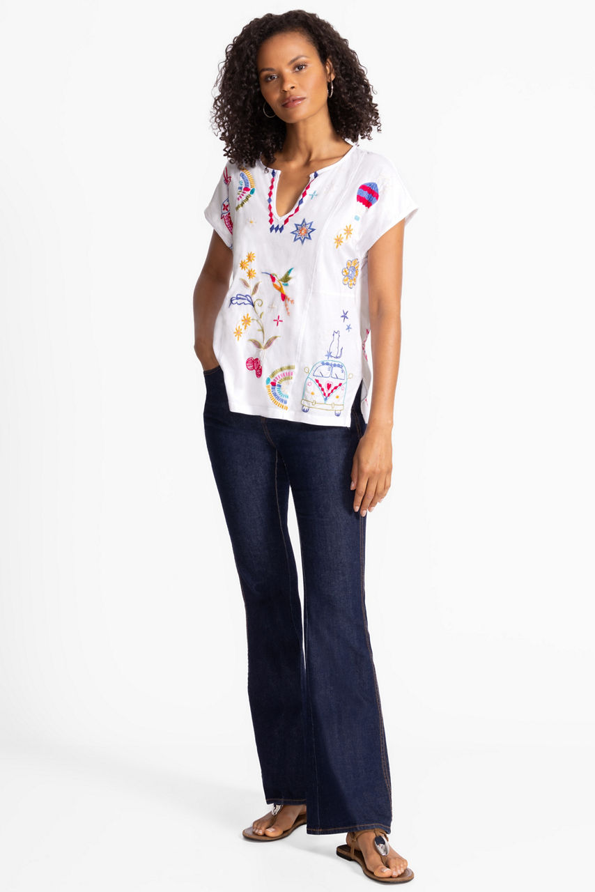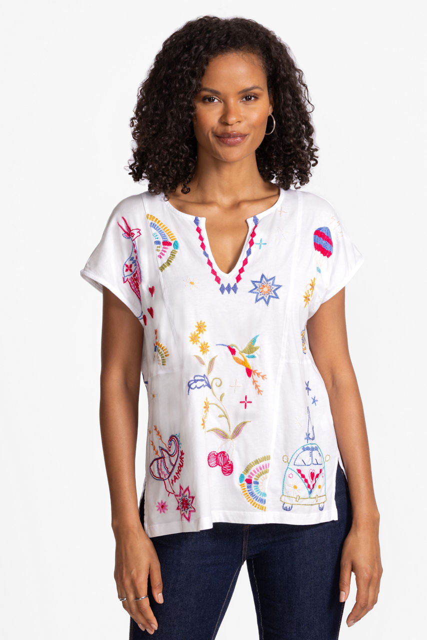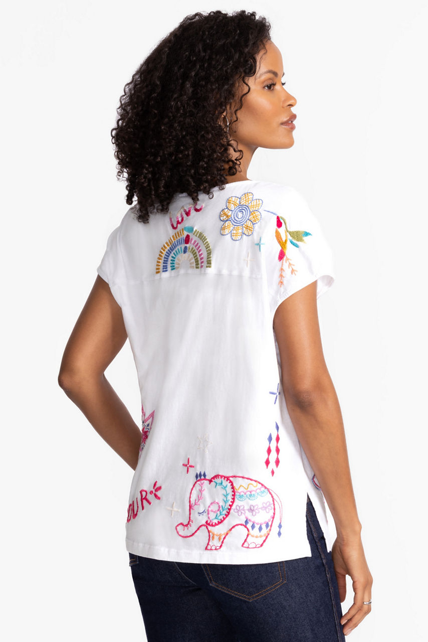 Beautifully embellished with colorful embroidered details, the Loulia Easy Paneled V-Neck Tee is crafted from 100% rich cotton. Featuring a V-neckline and dolman sleeves, this tee is designed with a series of panels at the front and back resulting in an elevated seamed appearance. Pair with linen trousers and polished slides for a refined casual look.