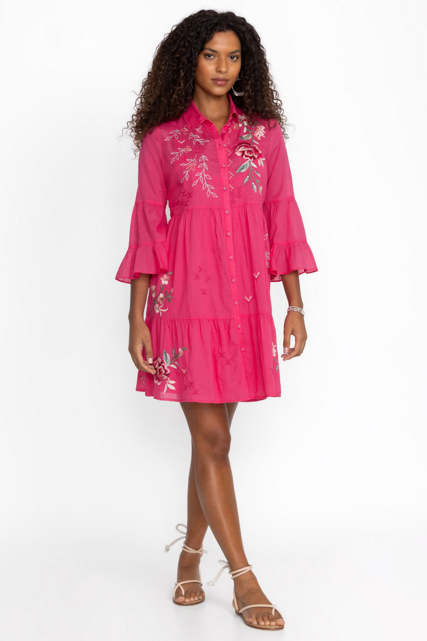 Crafted from 100% breathable cotton, the Erinn Easy Tiered Dress is adorned with splashes of vibrant color and pattern. Featuring a collared button front and tiered A-line skirt, this slip-lined dress is embellished with intricate placement embroidery. Pair with fashion sneakers and a trendy crossbody for a day of sightseeing.