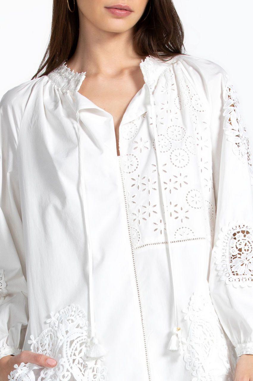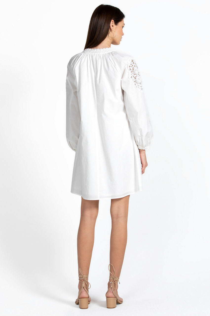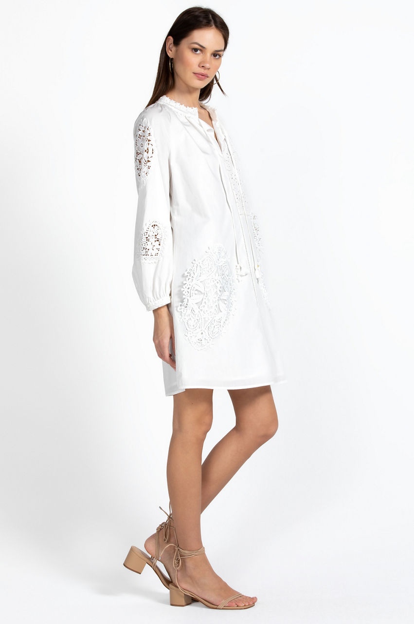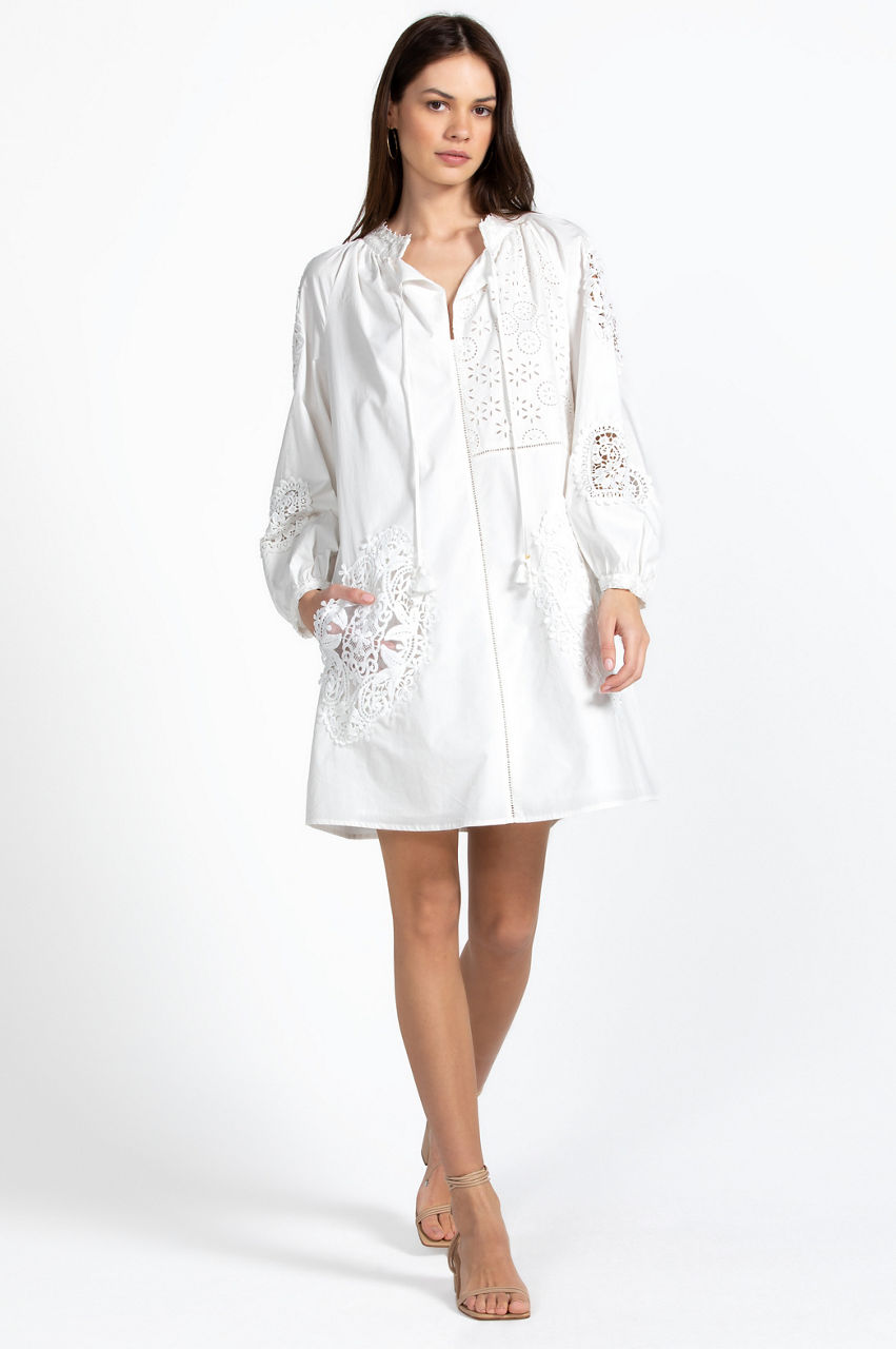 Crafted to perfection, the Ekaterina Mini Dress is a bohemian take on a classic warm-weather silhouette. Crafted from breathable cotton poplin with a subtle yet detailed pattern, this mini dress is designed to transcend seasons thanks to its versatile and timeless design. Finished with a round tie neck and long sleeves, this dress can be paired with flats or dressed up with heels for a chic vacation evening look.