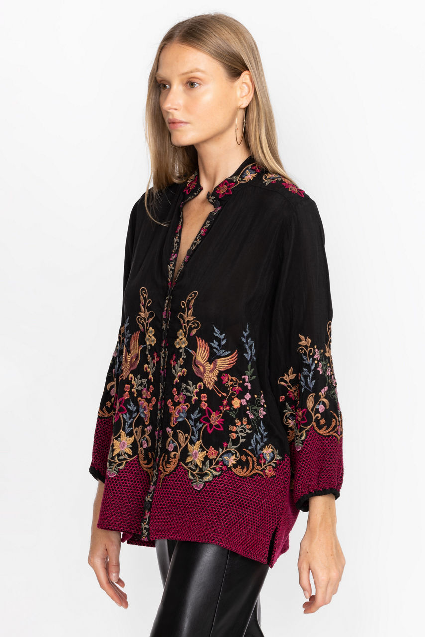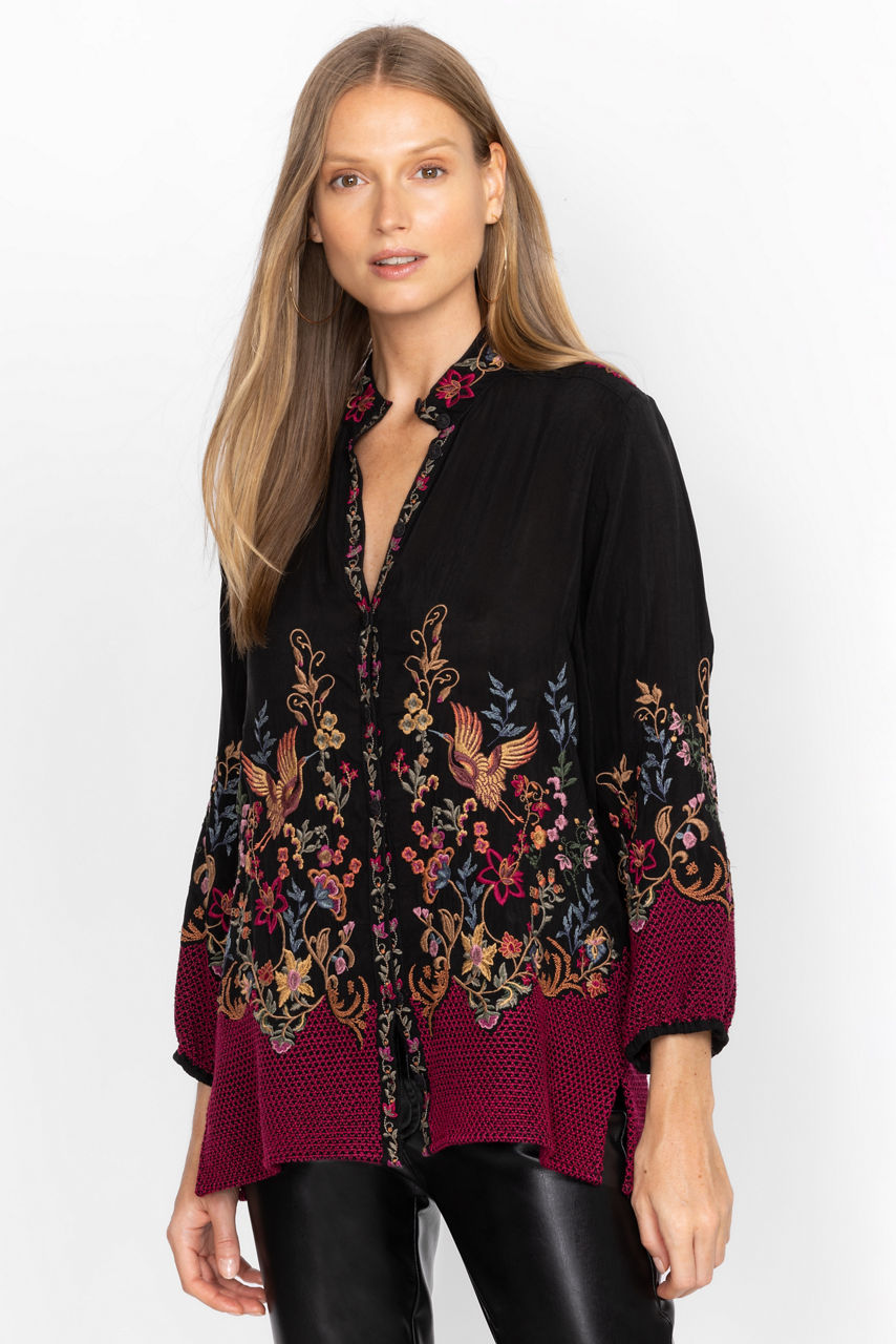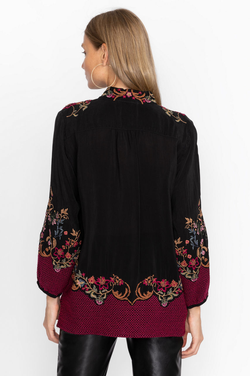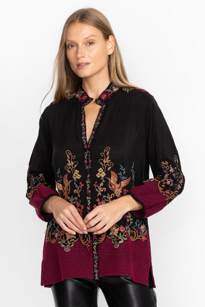 Featuring a bold design in an eye-catching silhouette, the Eleana Blouse offers a distinctively modern cut. This button-front top boasts a banded collar and elastic cuffed sleeves as well as a unique color block pattern that draws attention to the intricately detailed embroidery. Pair with sleek leggings and ballet flats for a retro-chic ensemble.