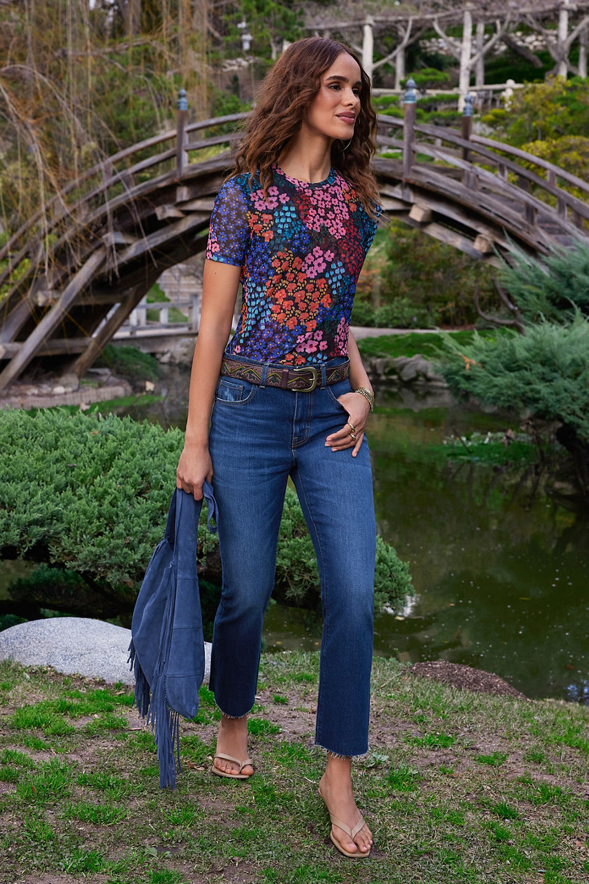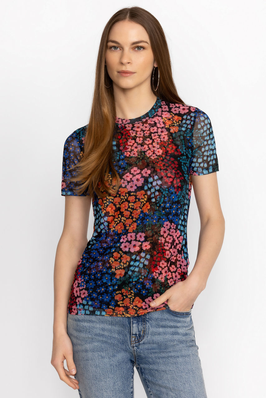 Featuring brilliant blooms in rich saturated color, the Astrid Mesh Tee is crafted from a lightweight, breathable material. Offering a crew neckline and short structured sleeves, this top adds a vibrant pop of color to your look. Layer under a classic blazer and pair with linen trousers for a polished workday look.