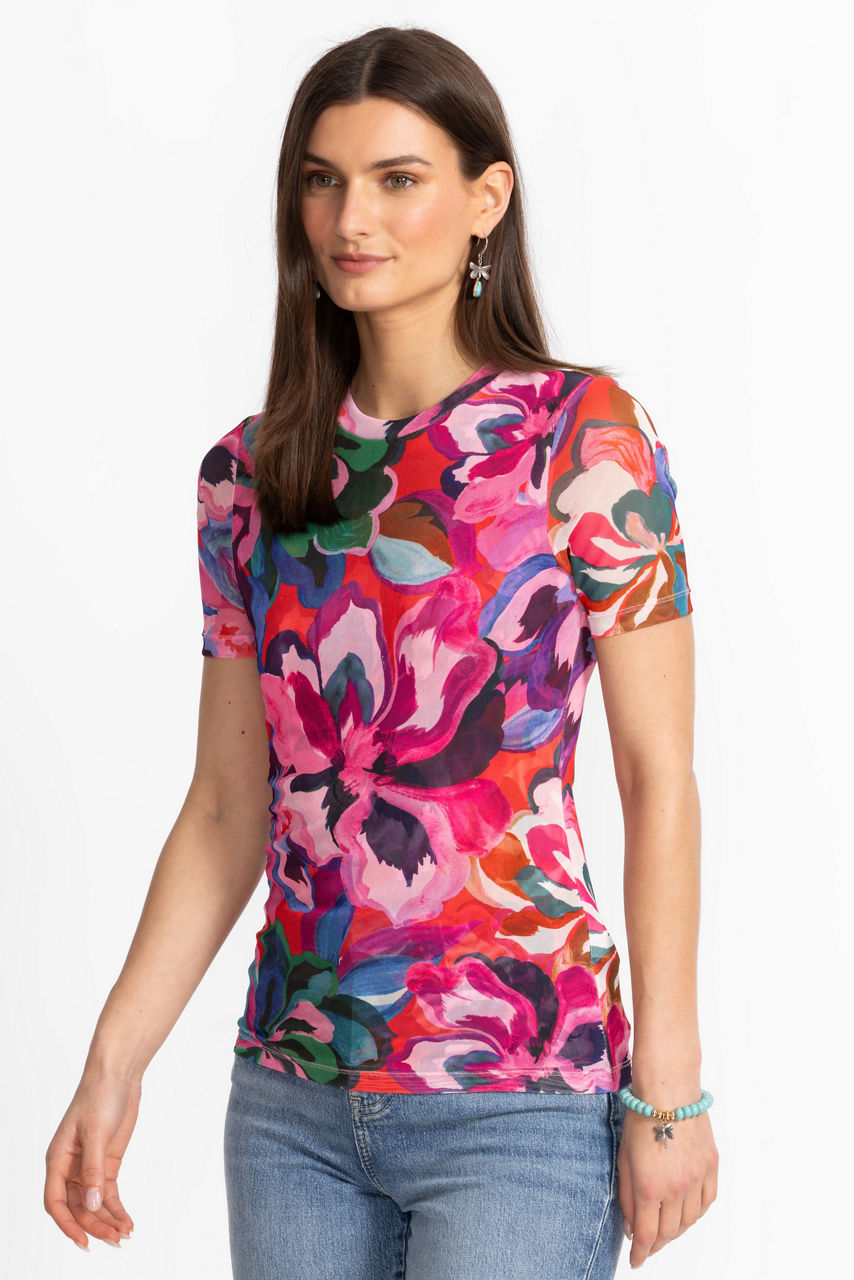 Crafted from a lightweight mesh fabric with a hint of stretch, the Eleanor Short Sleeve Mesh Tee is an elevated alternative to a classic tee. Featuring a crew neckline and short sleeves, this lined tee is embellished with an intricate scrolling paisley pattern in stunning hues of blue. Pair with a navy blazer and fitted pants for a polished modern office look.
