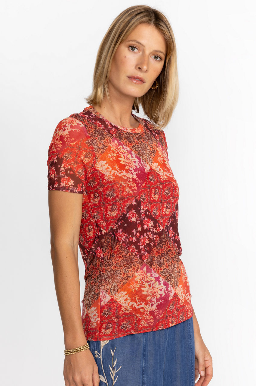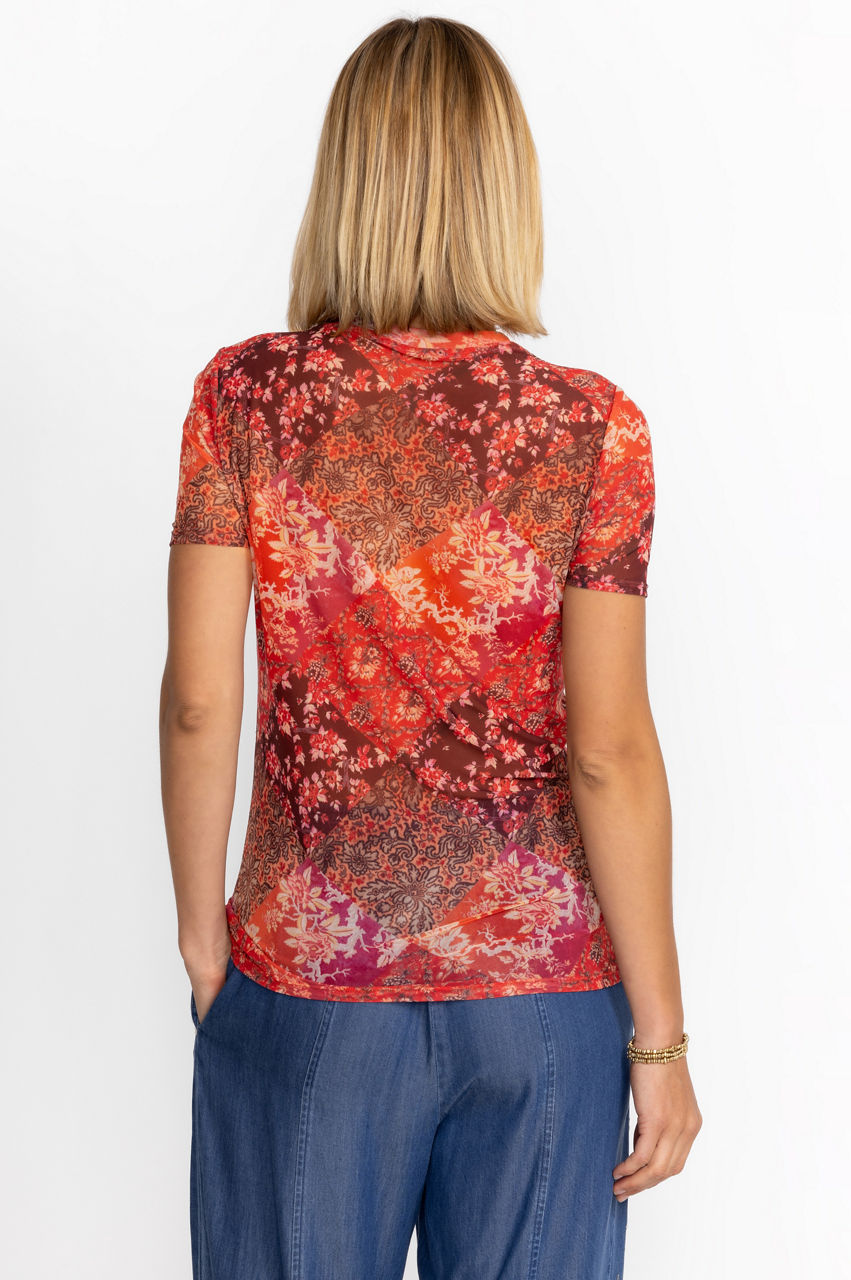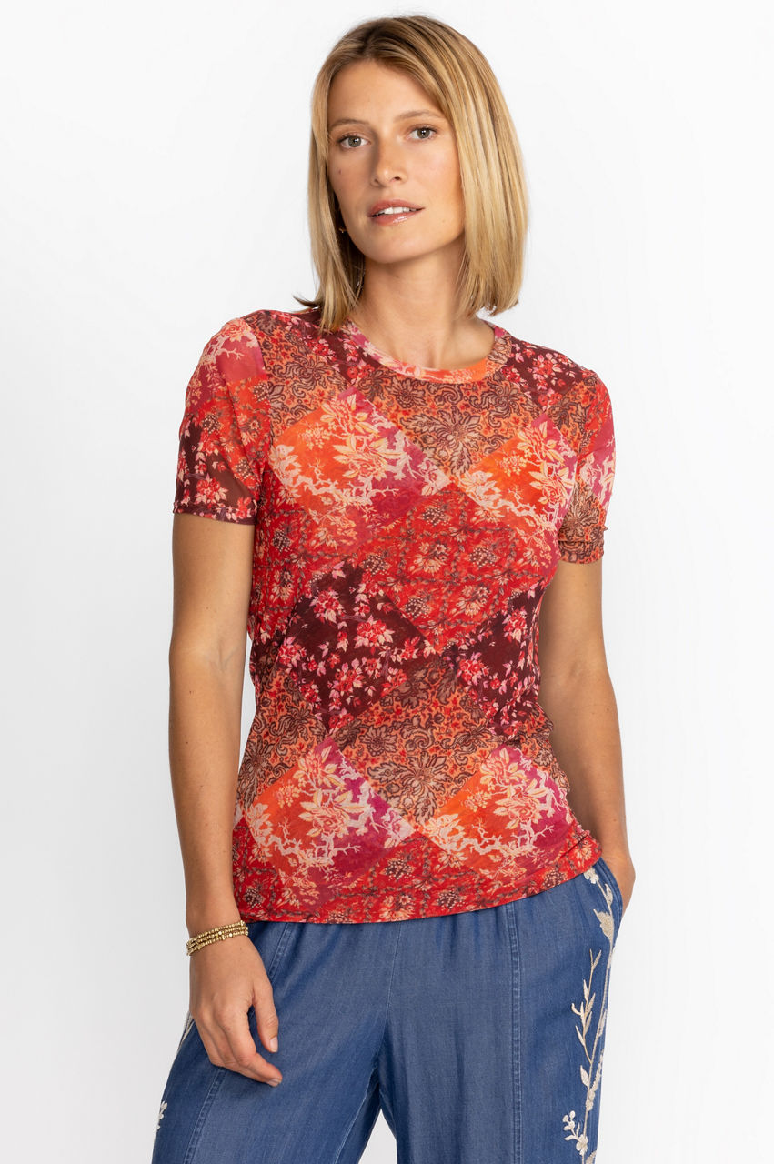 Crafted from a lightweight mesh fabric with a hint of stretch, the Eleanor Short Sleeve Mesh Tee is an elevated alternative to a classic tee. Featuring a crew neckline and short sleeves, this lined tee is embellished with an intricate scrolling paisley pattern in stunning hues of blue. Pair with a navy blazer and fitted pants for a polished modern office look.