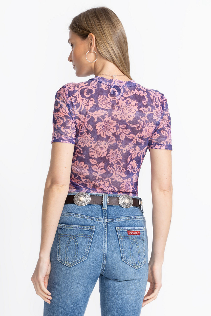 Crafted from a lightweight mesh fabric with a hint of stretch, the Eleanor Short Sleeve Mesh Tee is an elevated alternative to a classic tee. Featuring a crew neckline and short sleeves, this lined tee is embellished with an intricate scrolling paisley pattern in stunning hues of blue. Pair with a navy blazer and fitted pants for a polished modern office look.