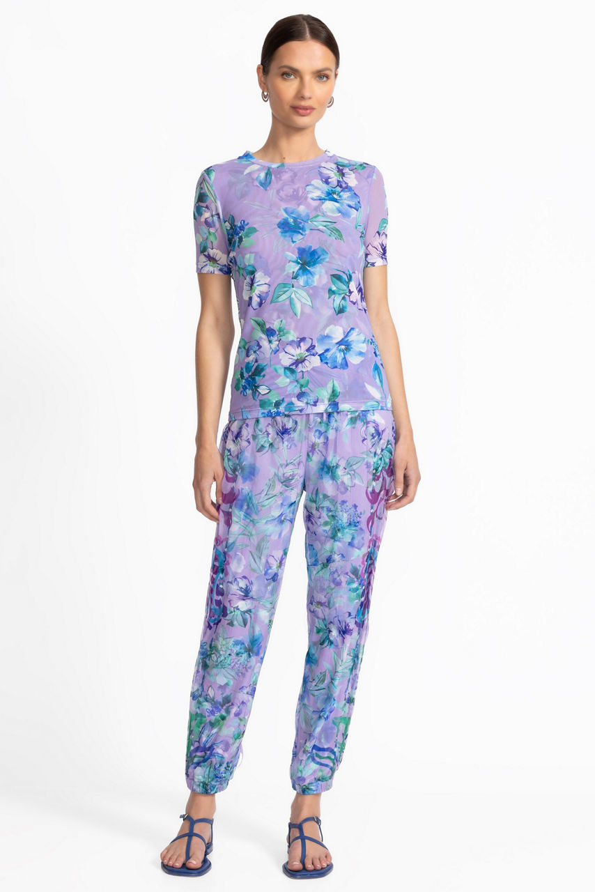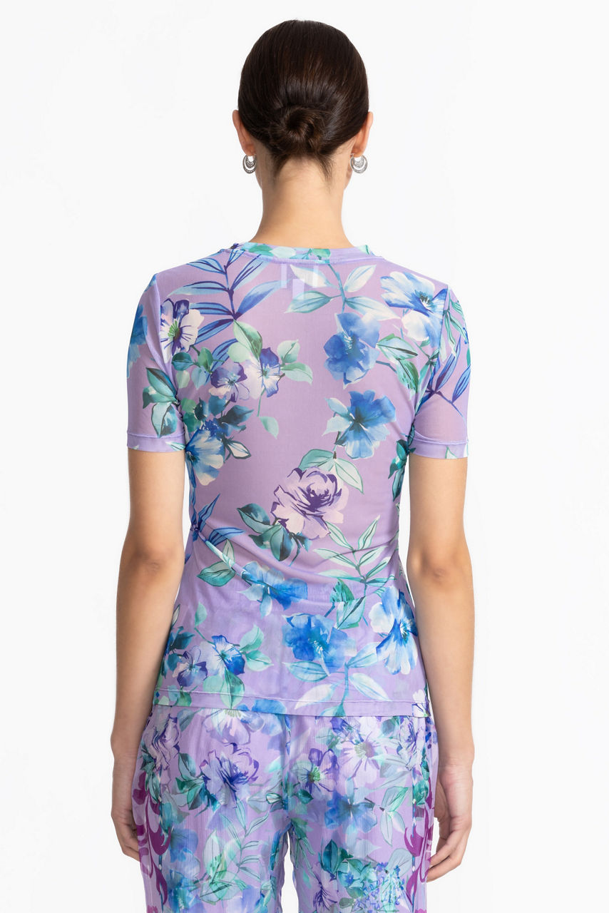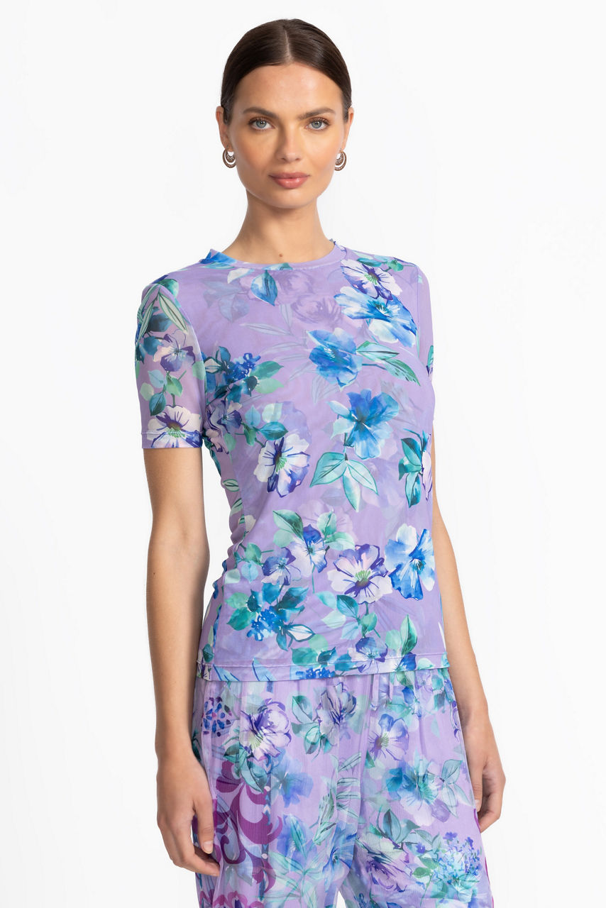 Crafted from a lightweight mesh fabric with a hint of stretch, the Eleanor Short Sleeve Mesh Tee is an elevated alternative to a classic tee. Featuring a crew neckline and short sleeves, this lined tee is embellished with an intricate scrolling paisley pattern in stunning hues of blue. Pair with a navy blazer and fitted pants for a polished modern office look.