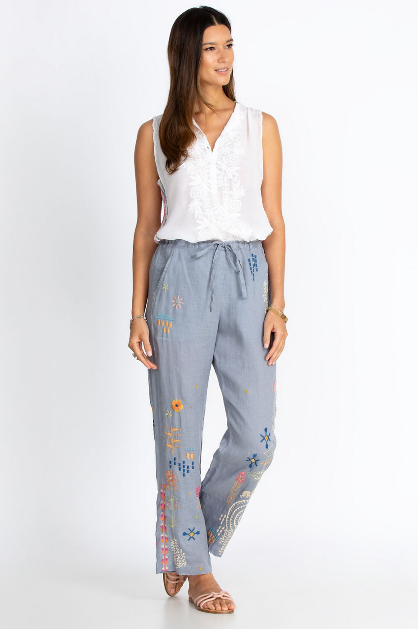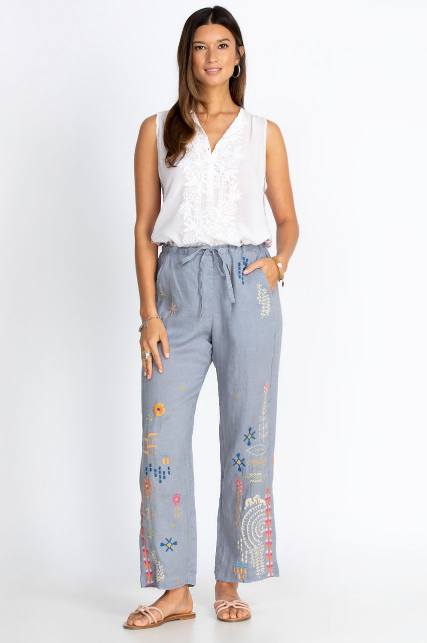 The Elektra Pant is flawlessly fabricated from classic linen with a luxe fit and has an effortless boho look. With their artisan print, you can easily pair these pants with your favorite Bohemian top or hoodie for an impromptu get-together with friends. Add dangly jewelry, a chic tunic, and classic heels to complete your timeless look.