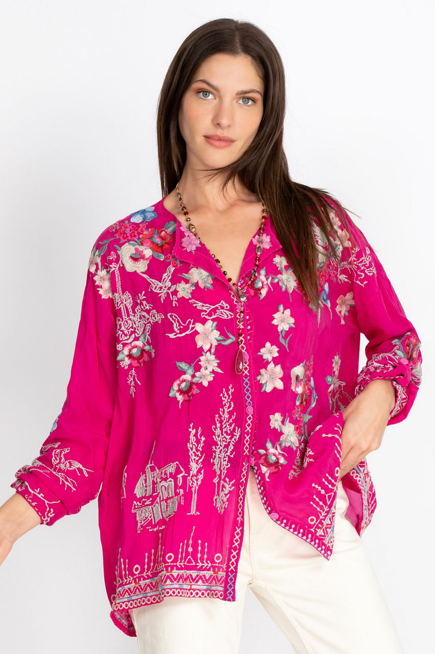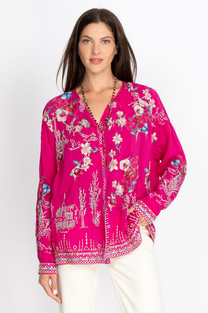 With its straight lines and flowy feel, the Elias Blouse is an elegant garment for warm weather. The blouse features an exquisite pattern that mixes floral designs with animals for a result that evokes nature. The geometric motifs of the hem, the V-shaped collar, and the three-quarter sleeves combine to create a modern feel. Wear it with some dark slacks to make the floral pattern pop, or combine it with cream-colored jeans for a fresh springtime look.