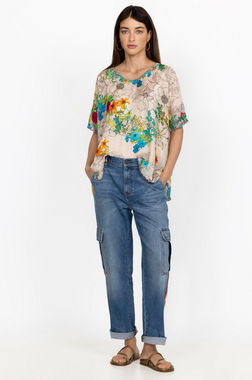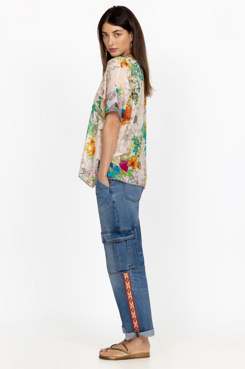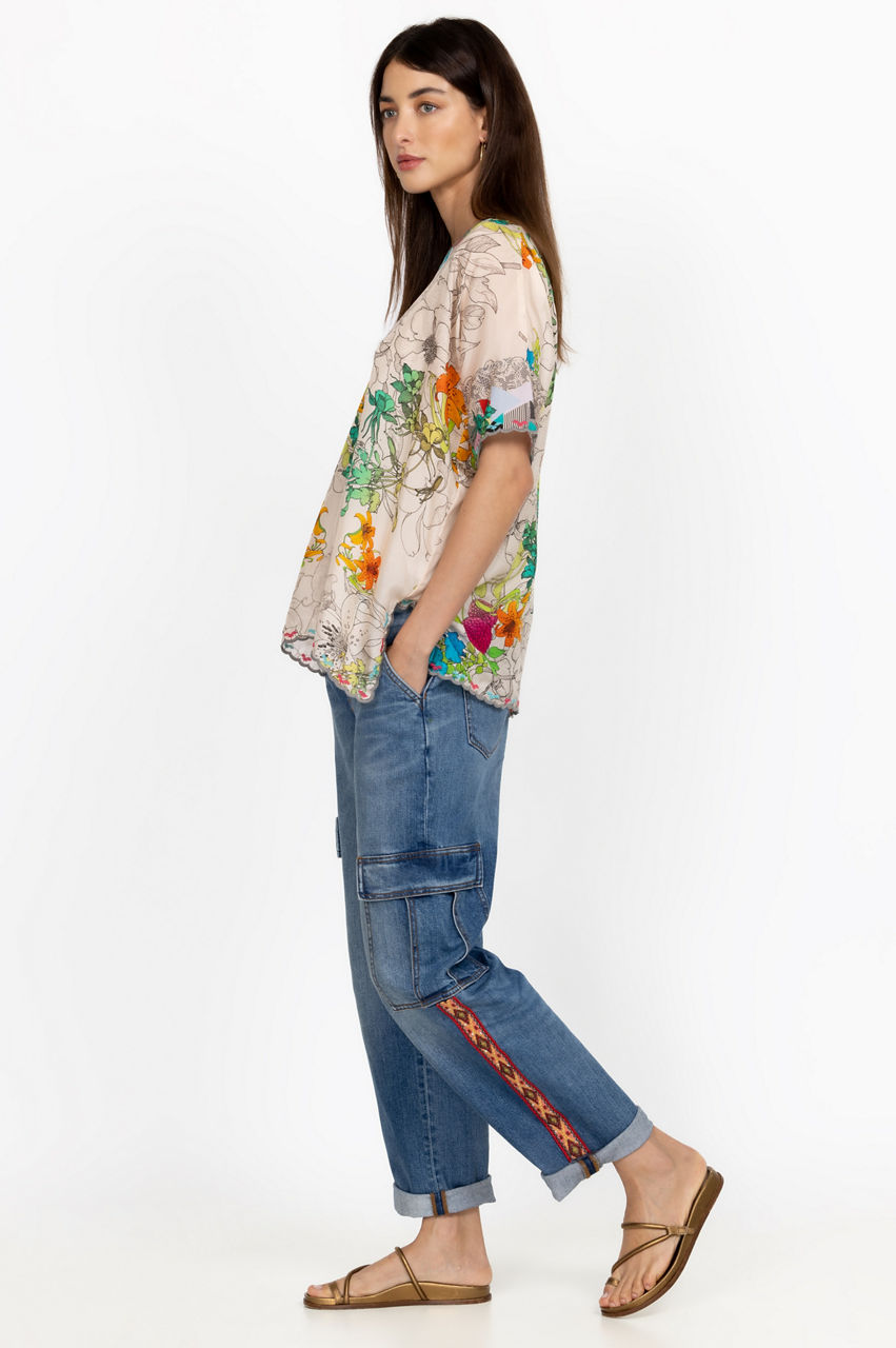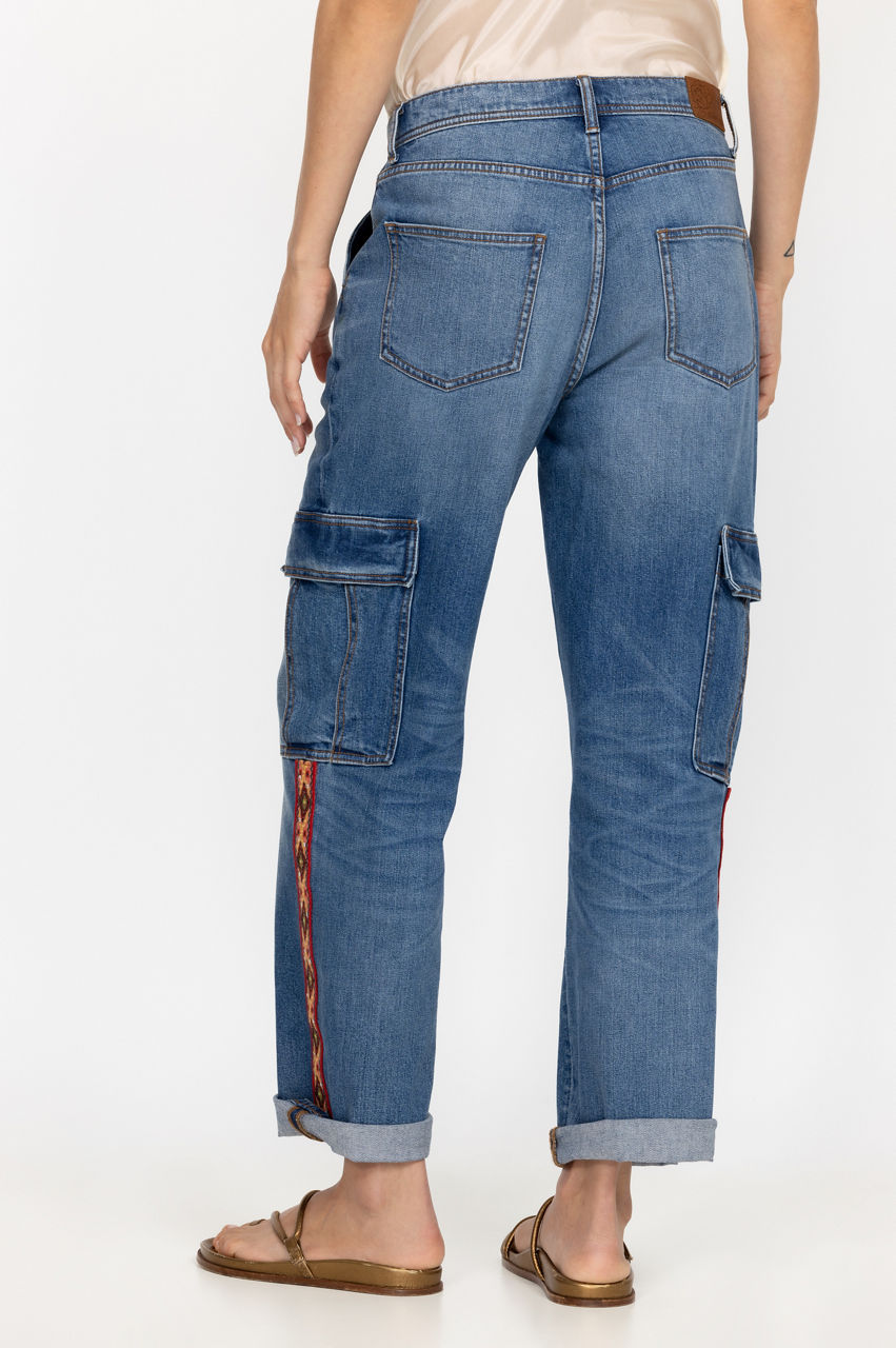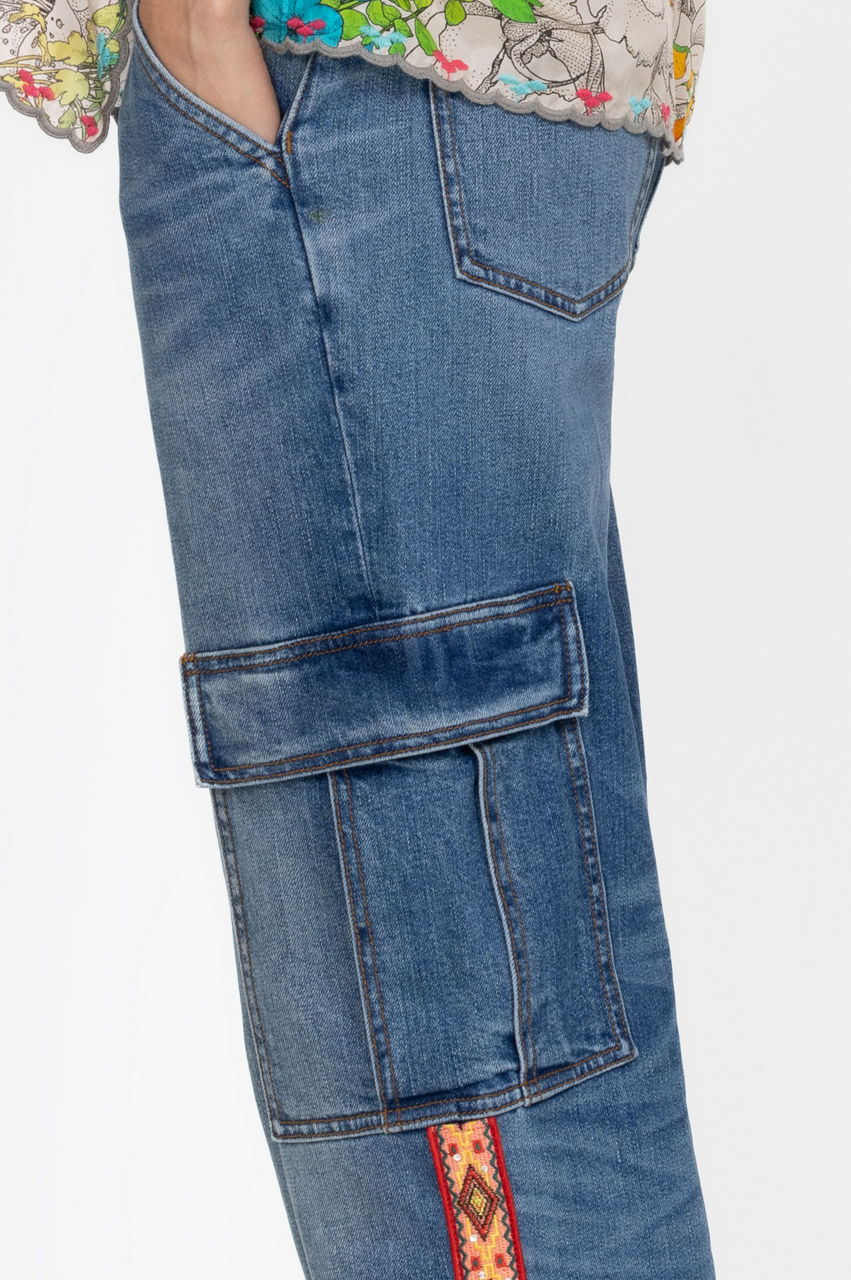Cut in a straight fit, the Eliza Cargo Pants are an innovative take on a popular 90's denim style. These pants are crafted from durable denim with added stretch and boast a front button and zip closure, two flap pockets at the sides, rolled cuffs, and a mix of sequins and embroidered patterns for an artistic look. Wear with a tee or opt for a cozy knit on cool days.