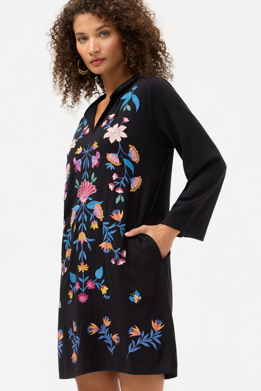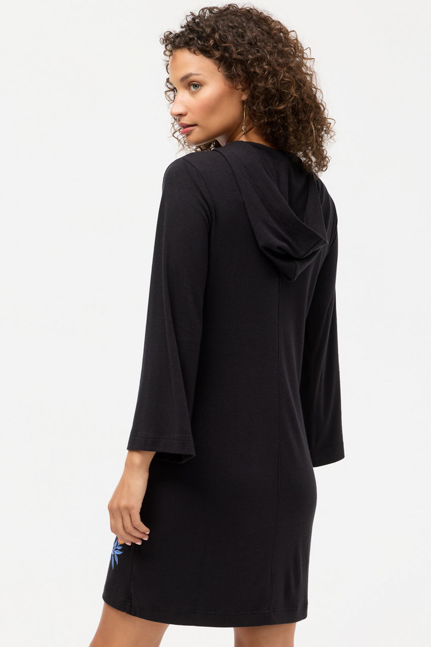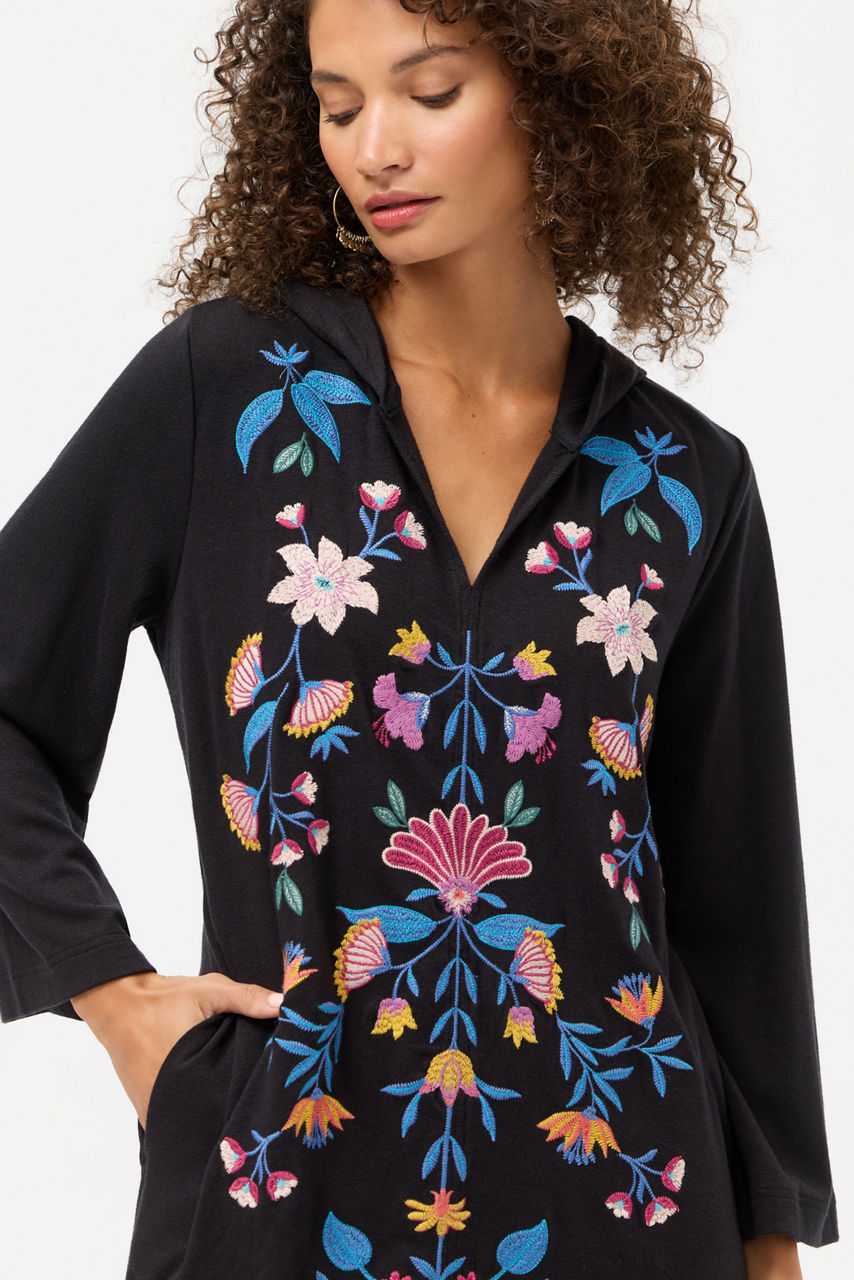 Embellished with vibrant floral embroidered detailing on a rich black backdrop, the Beach Hoodie Dress is equal parts functional and cozy. Featuring a V-neckline with an attached hood, this easy casual dress is finished with long sleeves and a straight hemline. Layer over Johnny Was swimwear and pair with a raffia beach tote for a day soaking up the sunshine.