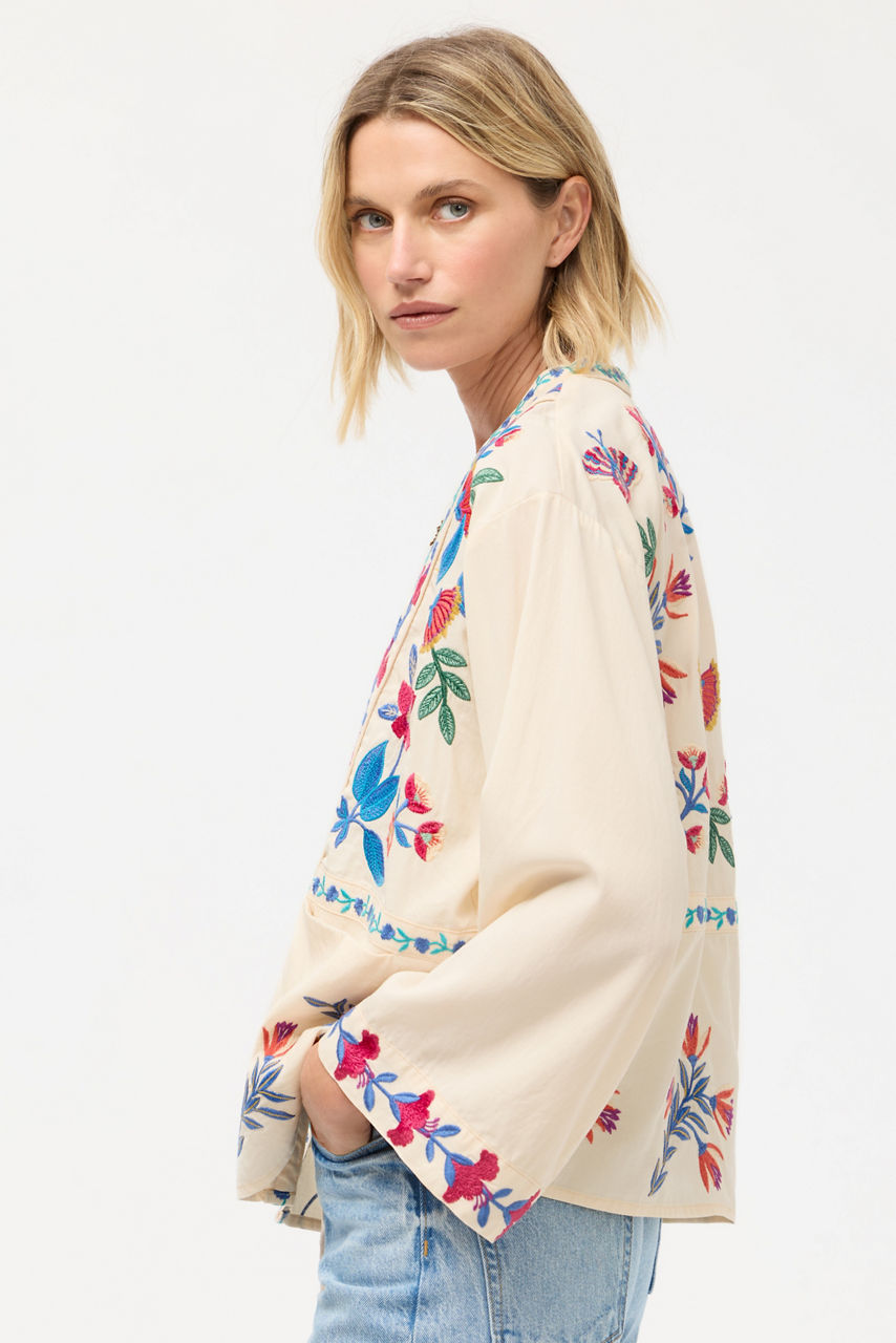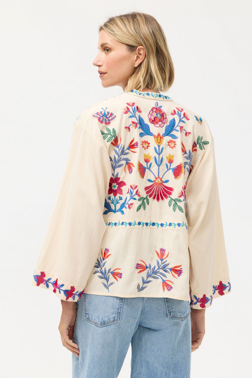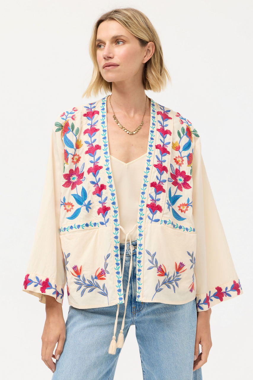 Adorned with intricately embroidered florals, the Front Tie Patchwork Kimono is crafted from a rich cotton blend. Featuring a unique embroidered tie at the front and wide kimono-style sleeves, this layering piece is finished with a contrasting border at the neckline and cuffs. Layer over a silk cami and pair with linen pants for an elevated casual look.