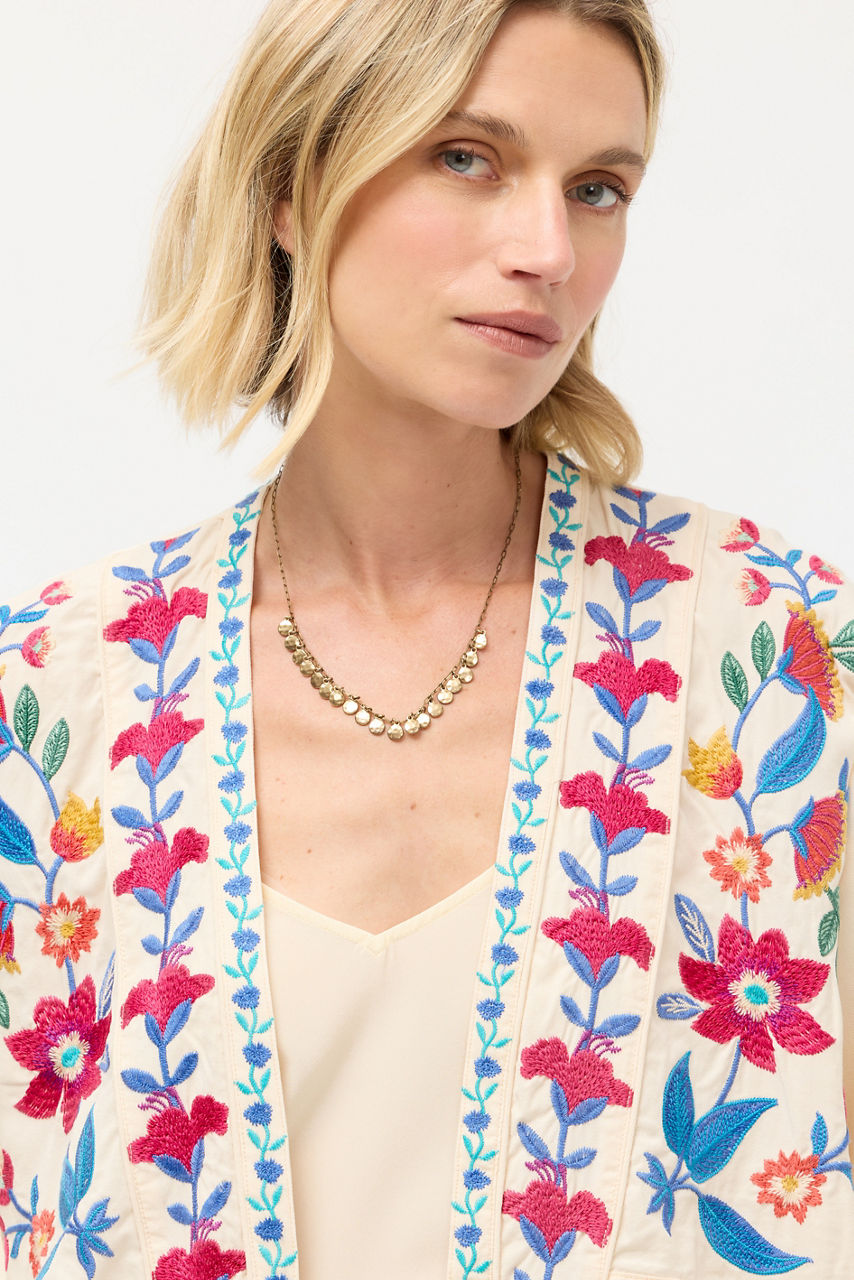 Adorned with intricately embroidered florals, the Front Tie Patchwork Kimono is crafted from a rich cotton blend. Featuring a unique embroidered tie at the front and wide kimono-style sleeves, this layering piece is finished with a contrasting border at the neckline and cuffs. Layer over a silk cami and pair with linen pants for an elevated casual look.