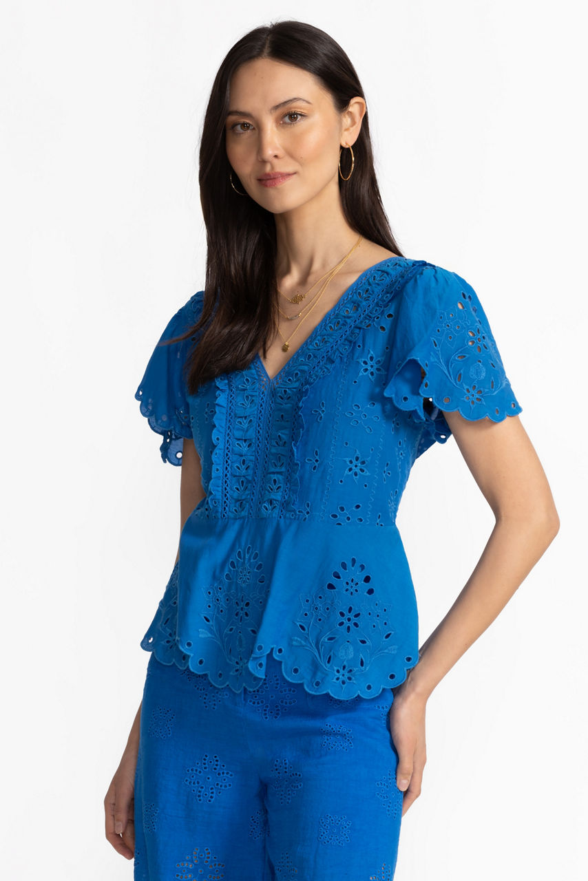Crafted from a lightweight cotton blend, the Elizabeth Peplum Blouse is embellished with delicate placement embroidery. Featuring a V-neckline at the front and back bordered by an intricate ruffle detail this distinctly feminine blouse is finished with scalloped edges at the sleeves and hemline. Pair with a linen maxi skirt and wedge espadrilles for a fresh vacation-inspired look.