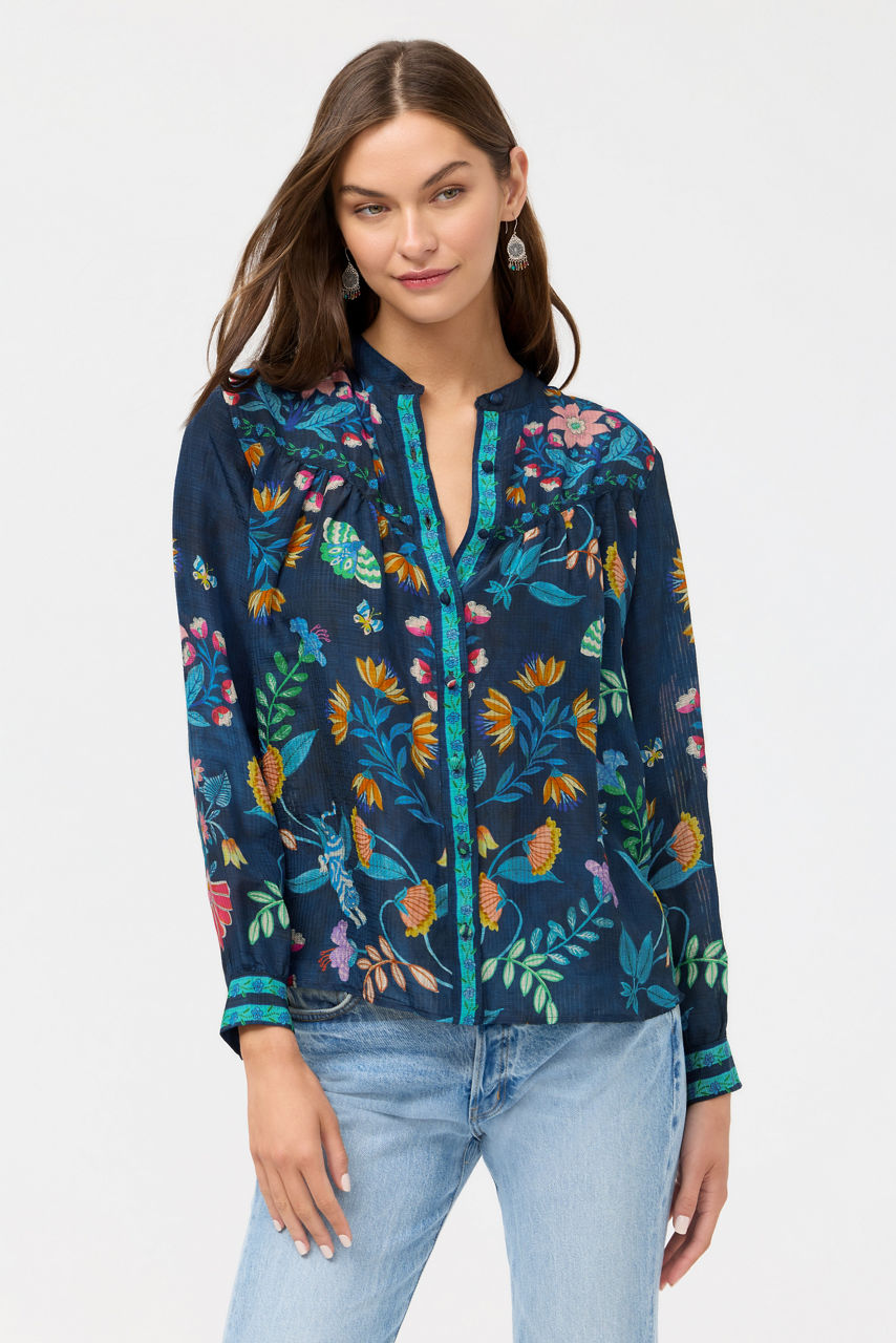 Crafted from an inventive silk and linen blend, the Shirred Western Shirt is embellished with a bold floral pattern in electric hues. Featuring a button front and a classic western yoke, this vibrant top is finished with gently puffed sleeves and a relaxed flowing bodice. Pair with fitted denim and western-style boots for a fresh take on western style.