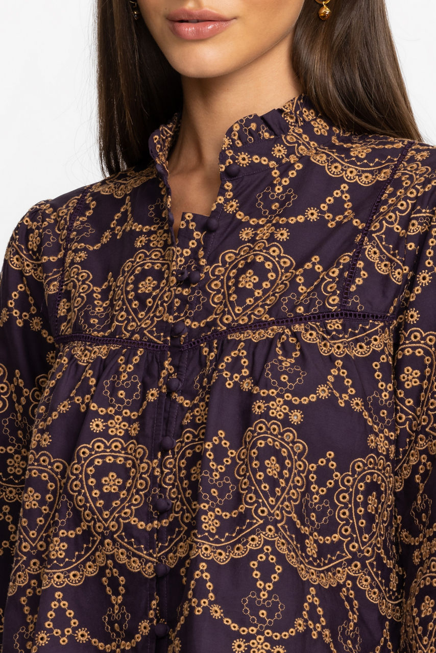 Designed from breathable cotton, the Elora Eyelet Blouse emanates a vintage aesthetic thanks to its intricate pattern and silhouette. Adopting a brown and purple color scheme, this blouse features long sleeves, a button front, and a high ruffle neck for a fanciful touch. Style this blouse with tailored pants and heels for a sophisticated day-to-night look.