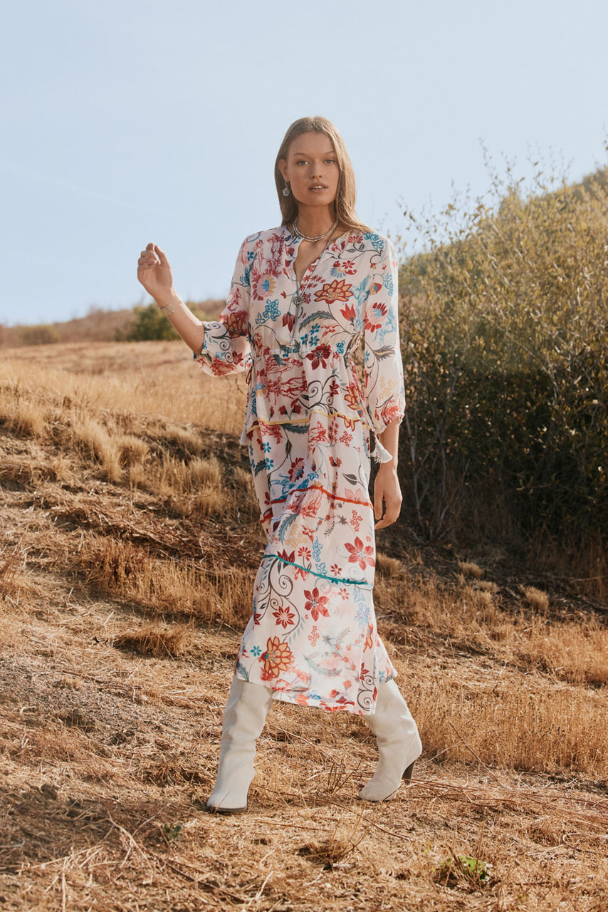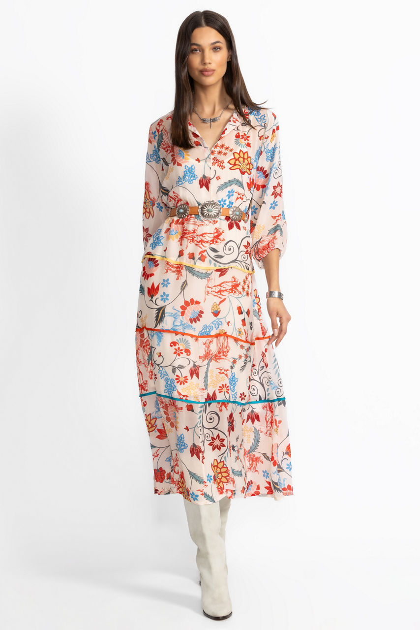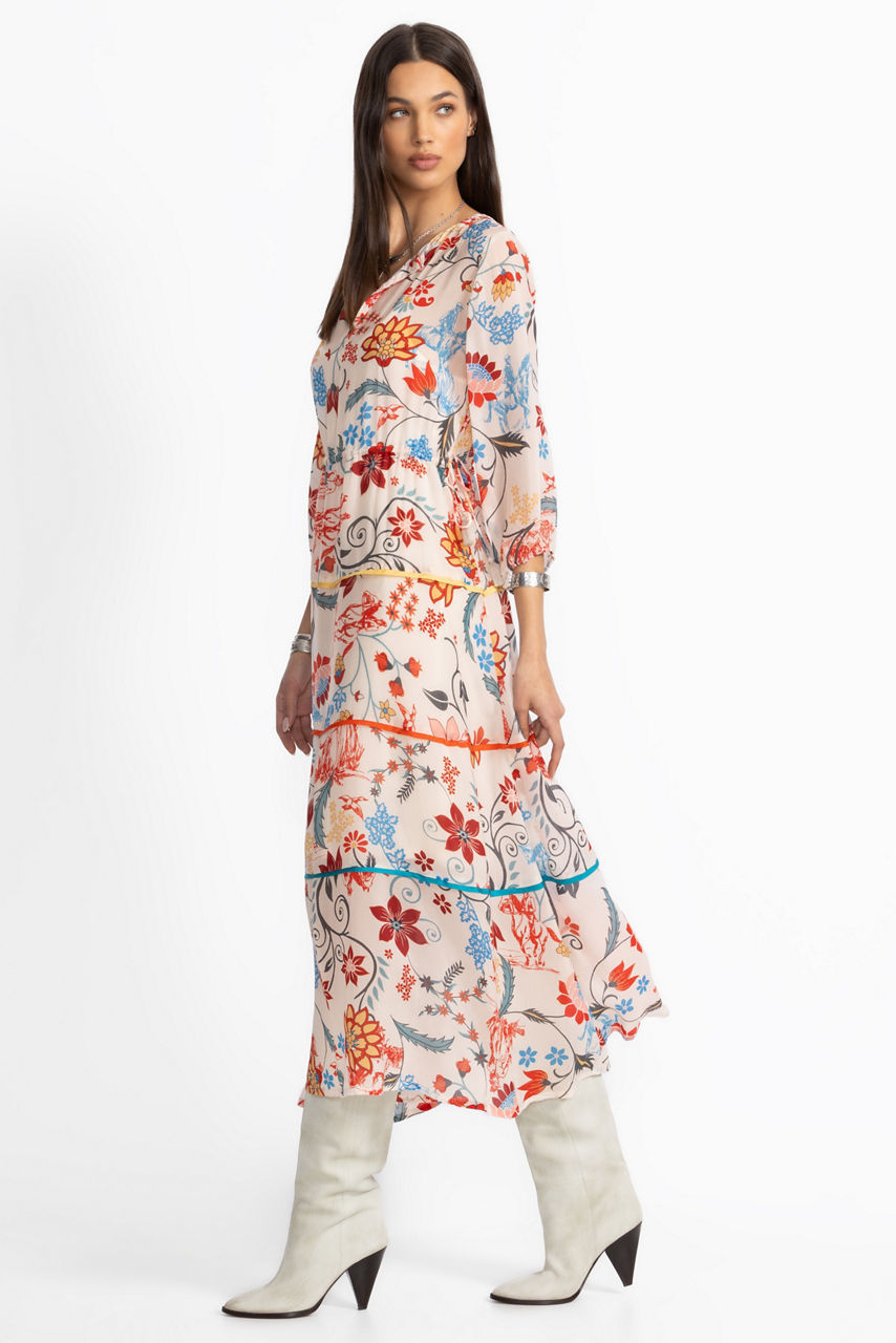 Boldly adorned with fresh florals in delightful primary colors, the Els Dress is crafted from a lightweight flowing fabric. Featuring a split V-neckline and 3/4 sleeves, this eye-catching slip-lined dress is finished with a drawstring waist and an A-line tiered skirt. Pair with espadrille wedge sandals and bold bangles for a vibrant vacation look.