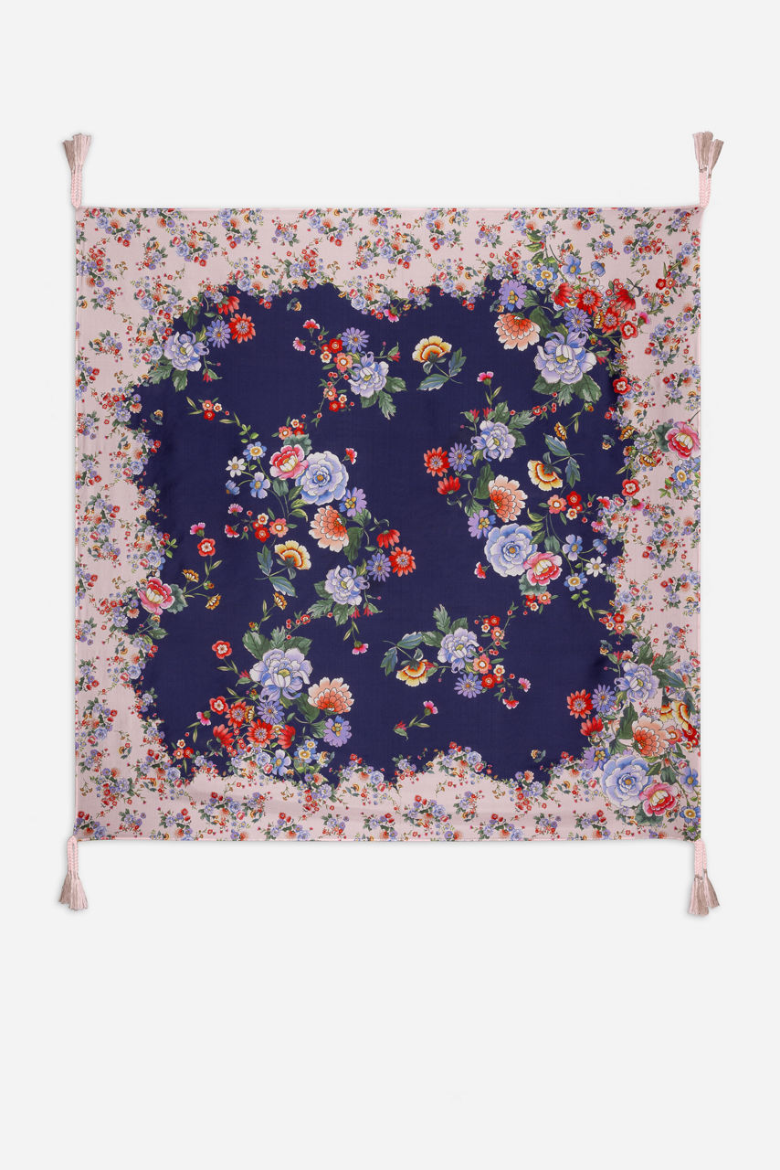 Featuring fresh florals and an inky backdrop, the Elsa Silk Scarf is bordered in white background with pastel florals for a stunning contrast. Crafted from 100% silk and finished with decorative tassels, this flowing scarf adds a touch of drama to any look. Tie at the neck or add to the handle of your favorite handbag for a pop of bold color.