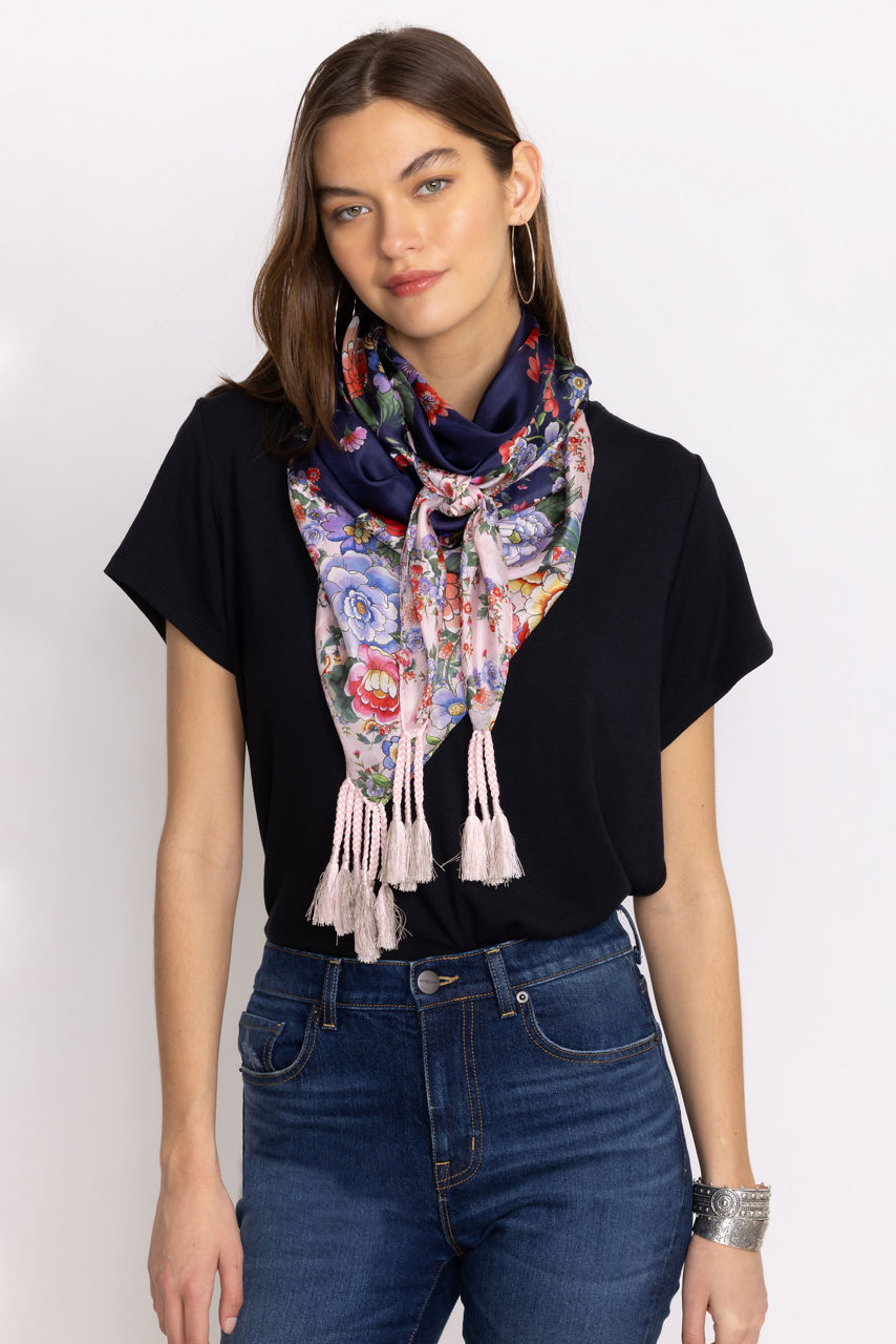 Featuring fresh florals and an inky backdrop, the Elsa Silk Scarf is bordered in white background with pastel florals for a stunning contrast. Crafted from 100% silk and finished with decorative tassels, this flowing scarf adds a touch of drama to any look. Tie at the neck or add to the handle of your favorite handbag for a pop of bold color.