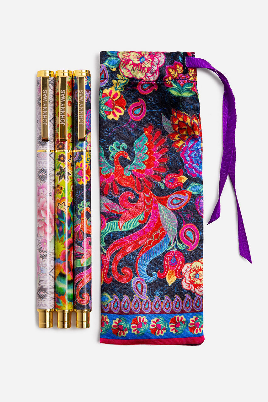 Communicating style and grace, the Emberwing Pen Set offers three beautiful writing instruments ornately decorated with vibrant images. Featuring an elegant satin bag for storage when not in use, this opulent set is a perfect gift. Pair with a unique journal for a gift that will be well received.