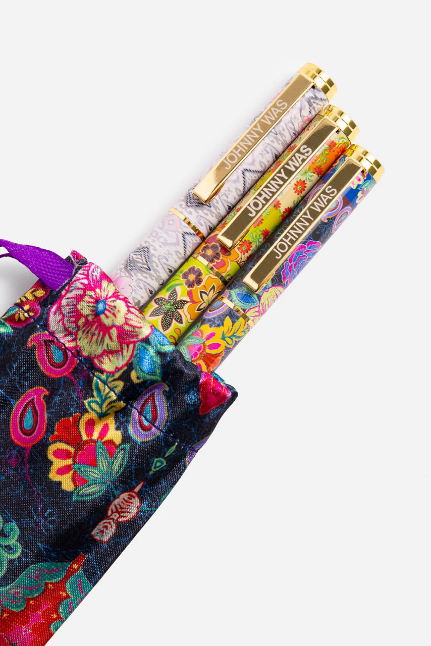 Communicating style and grace, the Emberwing Pen Set offers three beautiful writing instruments ornately decorated with vibrant images. Featuring an elegant satin bag for storage when not in use, this opulent set is a perfect gift. Pair with a unique journal for a gift that will be well received.