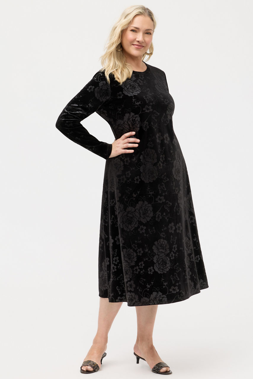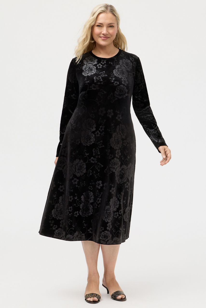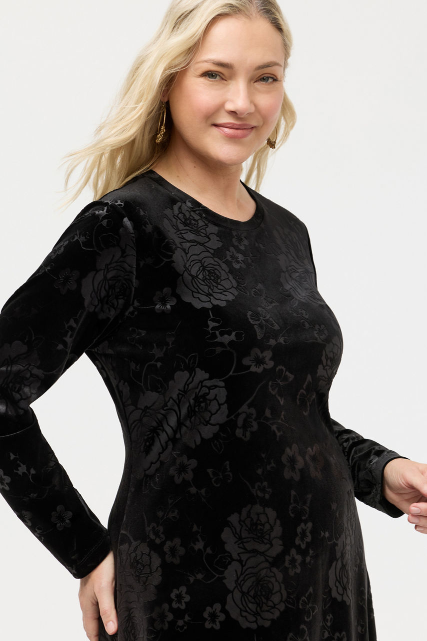 Crafted from a rich stretch velvet fabric, the Embossed Stretch Velvet Dress is equal parts comfort and elegance. Designed with a crew neckline and long sleeves, this unique dress is embossed with an eye-catching floral design and is finished with seaming at the back. Pair with metallic heels and a coordinating clutch for an evening out with friends.