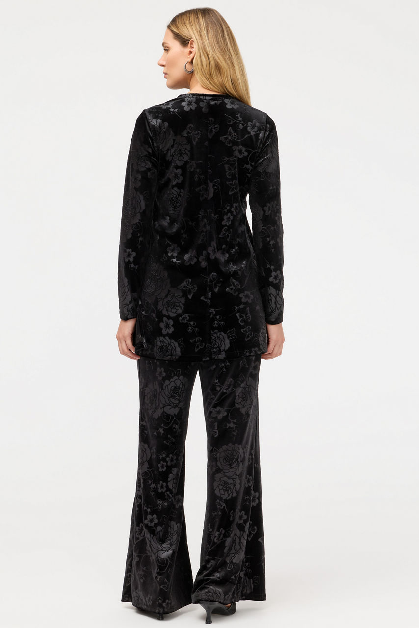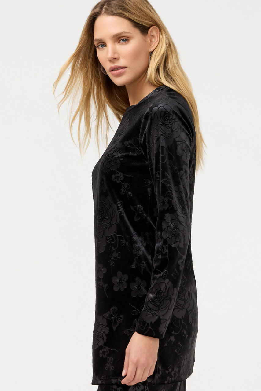 Crafted from a rich velvety textured fabric, the Embossed Stretch Velvet Tunic is both casual and elegant. Designed with a crew neckline and long sleeves, this cozy tunic is embossed with an eye-catching floral pattern. Pair with the Embossed Stretch Velvet Wide Leg Pants and colorful flats for a comfortable weekend look with lots of style.