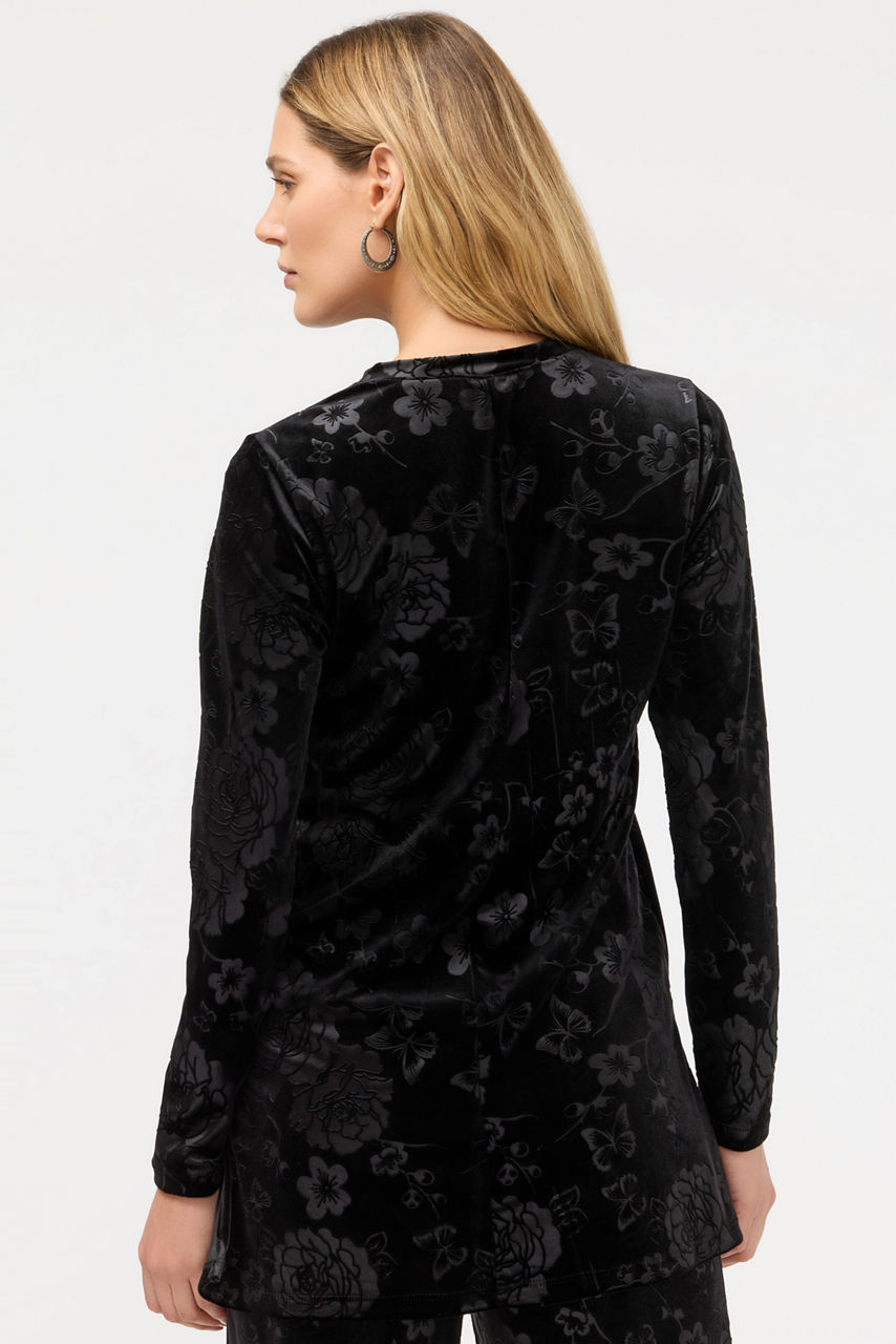 Crafted from a rich velvety textured fabric, the Embossed Stretch Velvet Tunic is both casual and elegant. Designed with a crew neckline and long sleeves, this cozy tunic is embossed with an eye-catching floral pattern. Pair with the Embossed Stretch Velvet Wide Leg Pants and colorful flats for a comfortable weekend look with lots of style.