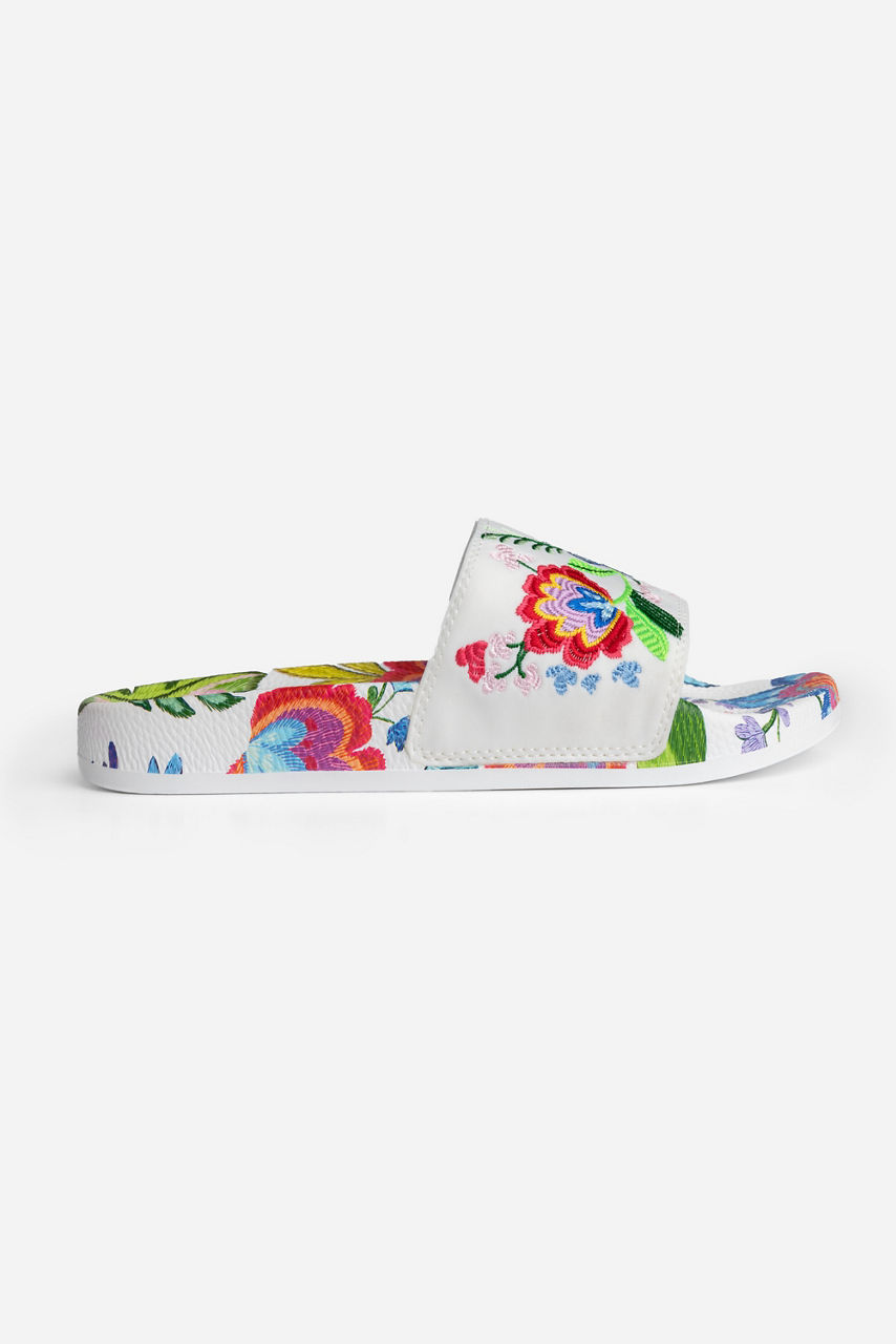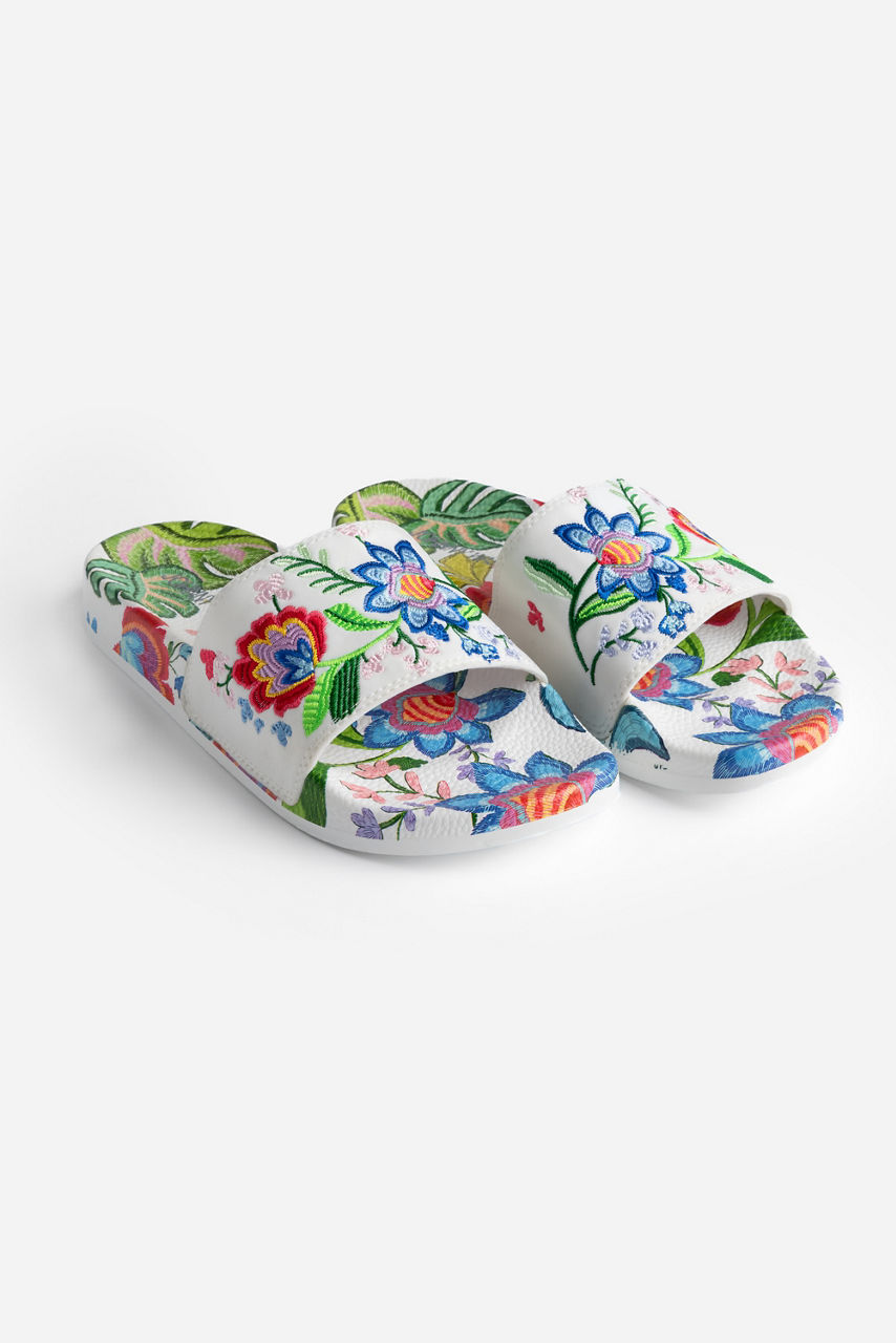 Beautifully adorned with a colorful floral pattern, the Embroidered Pool Slides add a touch of whimsy to your poolside attire. Featuring a comfortable molded footbed and platform sole, these stylish slides are finished with a wide strap embellished with intricate embroidered detailing. Pair with colorful swim attire and a breezy linen cover up for a resort-ready ensemble.
