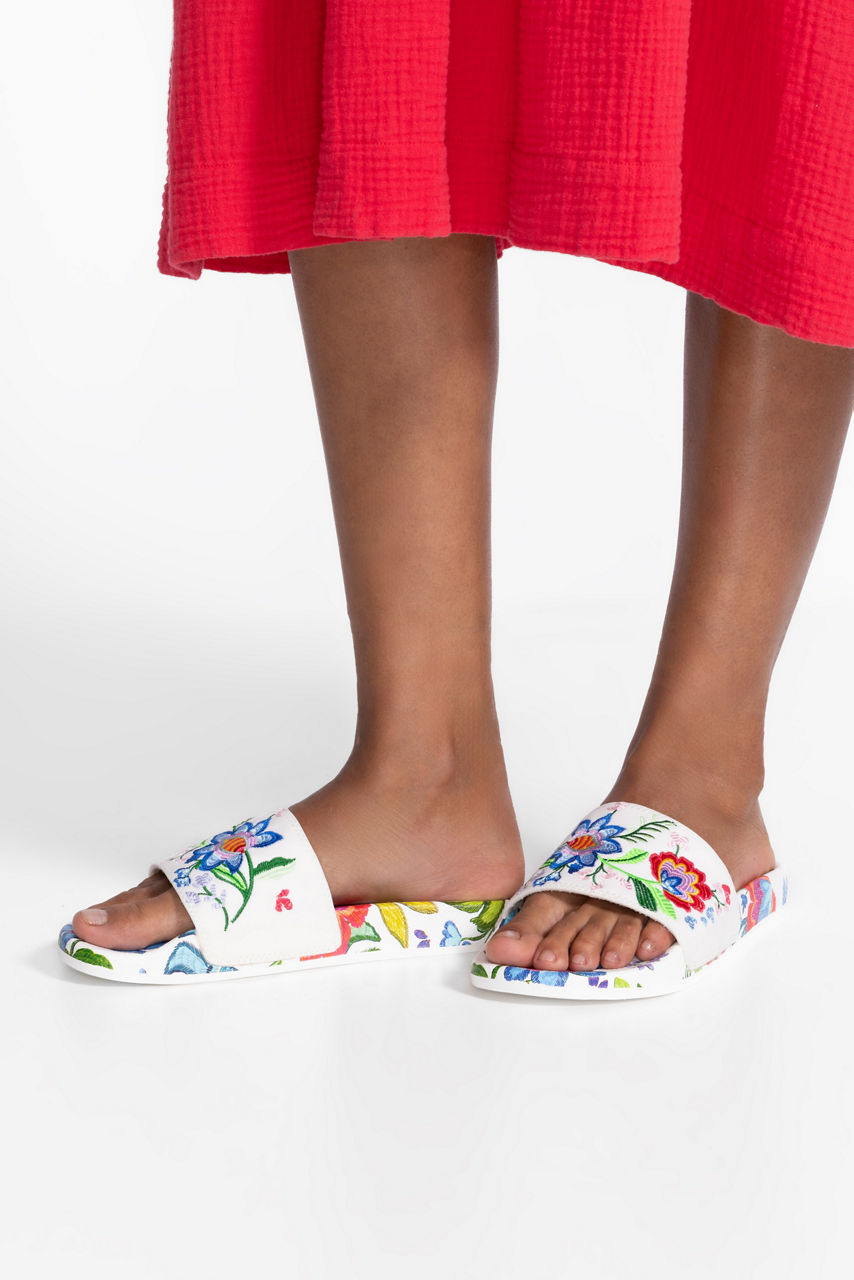 Beautifully adorned with a colorful floral pattern, the Embroidered Pool Slides add a touch of whimsy to your poolside attire. Featuring a comfortable molded footbed and platform sole, these stylish slides are finished with a wide strap embellished with intricate embroidered detailing. Pair with colorful swim attire and a breezy linen cover up for a resort-ready ensemble.