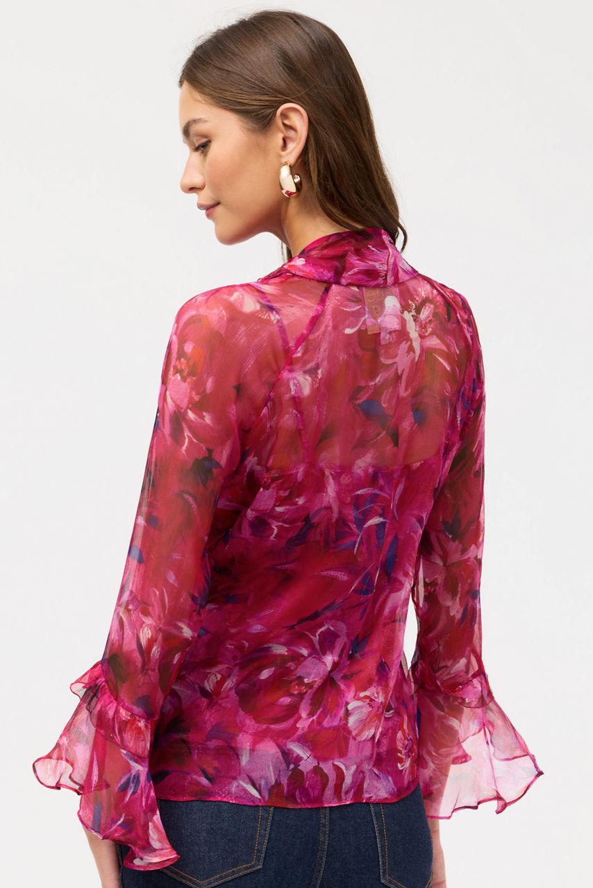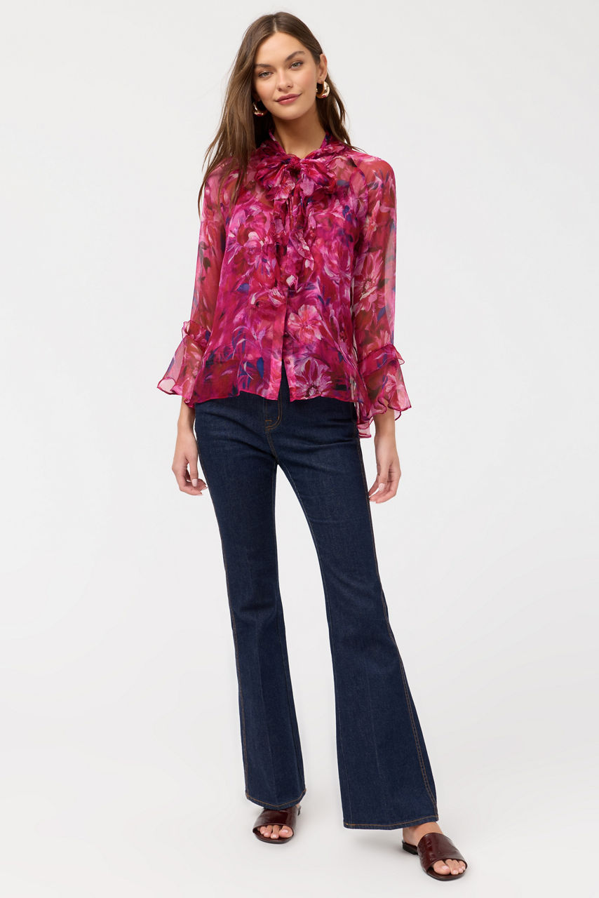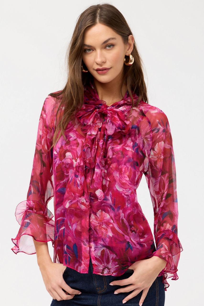 Crafted from luxurious 100% silk, the Emerie Ruffle Button Down Shirt is embellished with a bold floral pattern in hues of pink. Featuring a tie at the neck and ruffle detailing along the front, this breezy slip-lined blouse is finished with bell sleeves for a dramatic flair. Pair with black palazzo pants and strappy heels for a polished evening look.