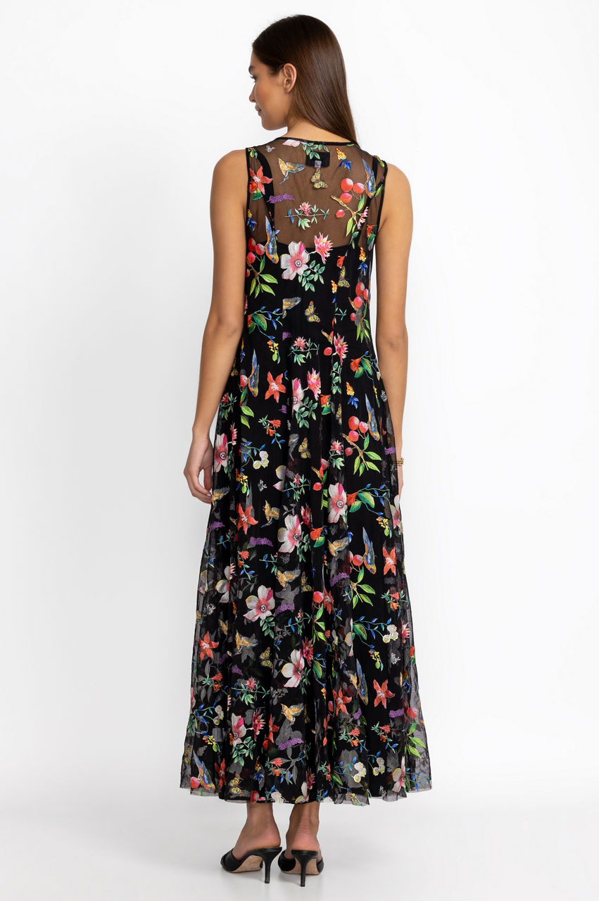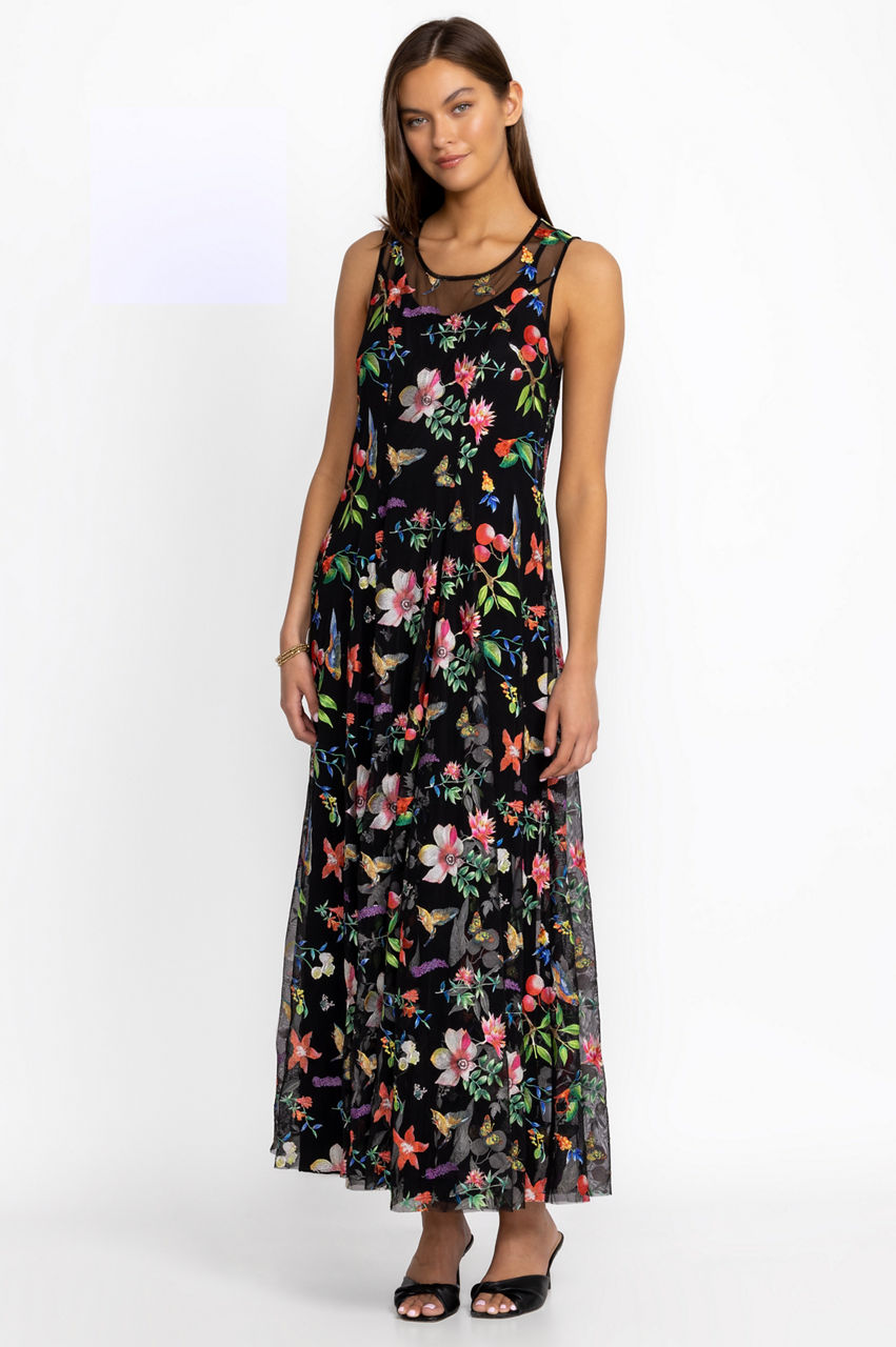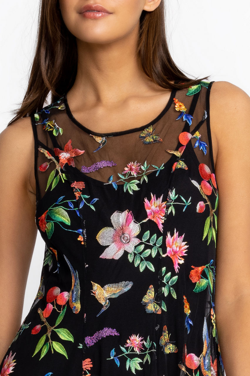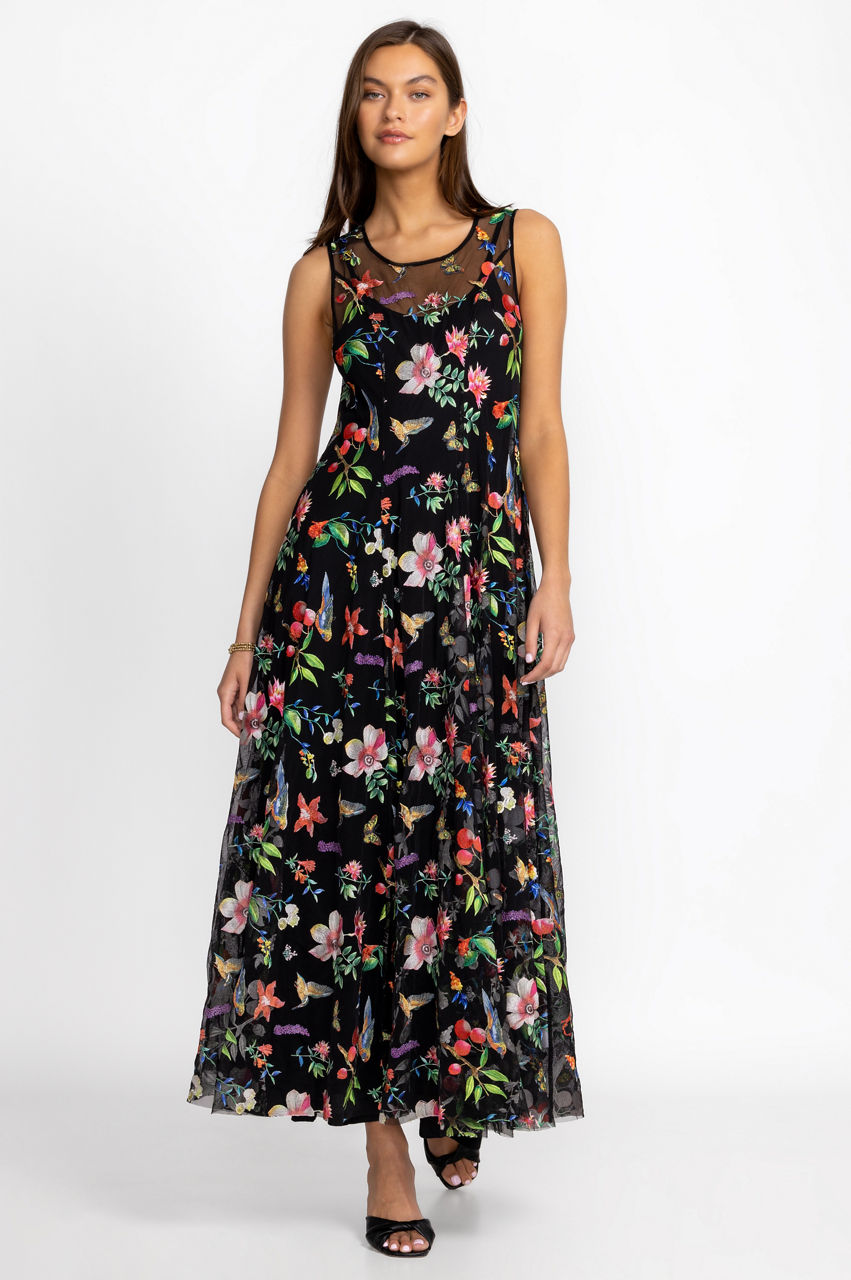 Embellished with romantic blooms, the Emilda Mesh Dress puts a contemporary spin on a classic style. A feminine choice for warmer days, this sleeveless dress is made from a lightweight fabric with a round neck, a flared hem, and fragrant flowers in red and pink shades. Pair this dress with a low heel for an elegant day-to-night look.