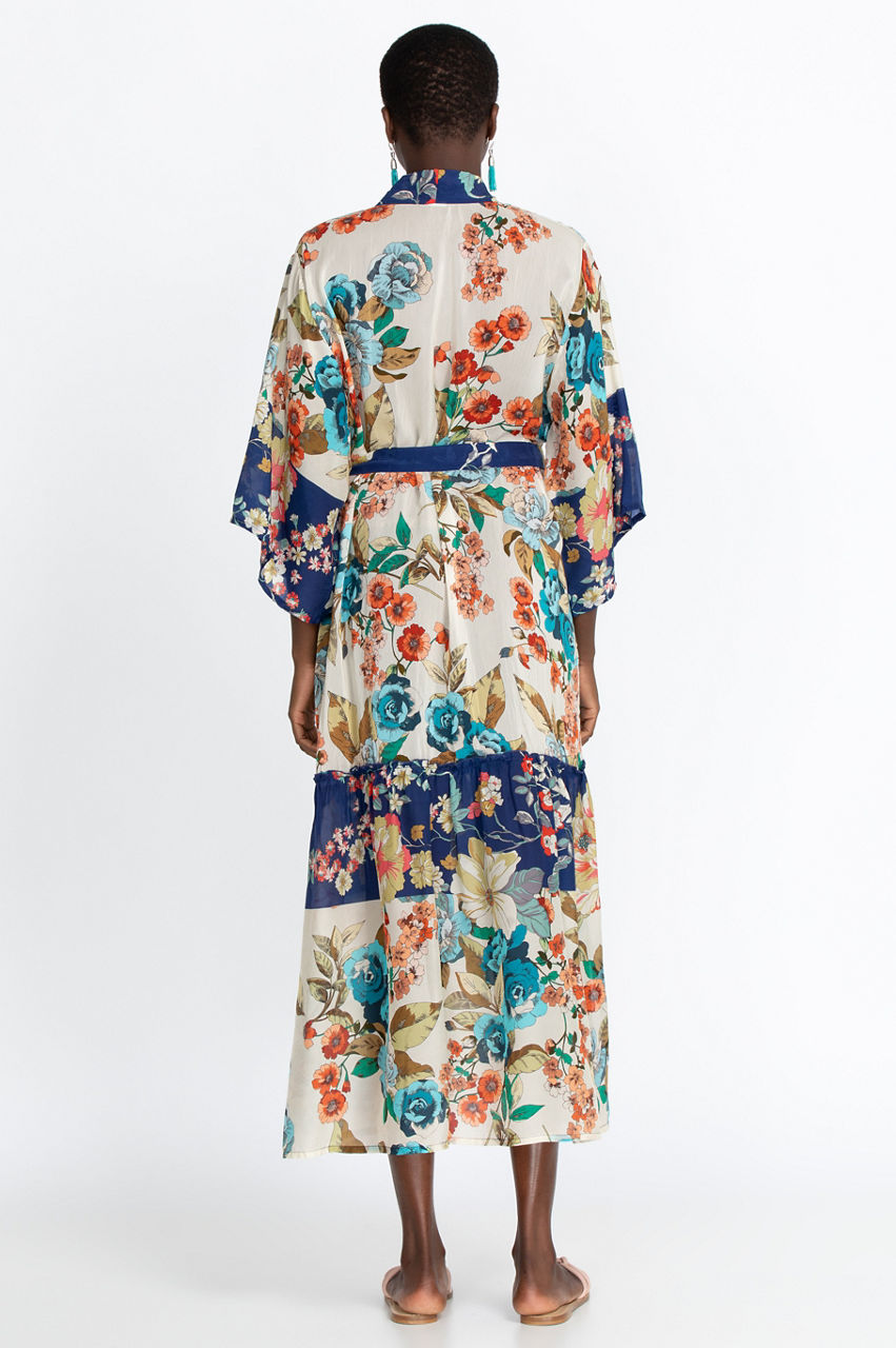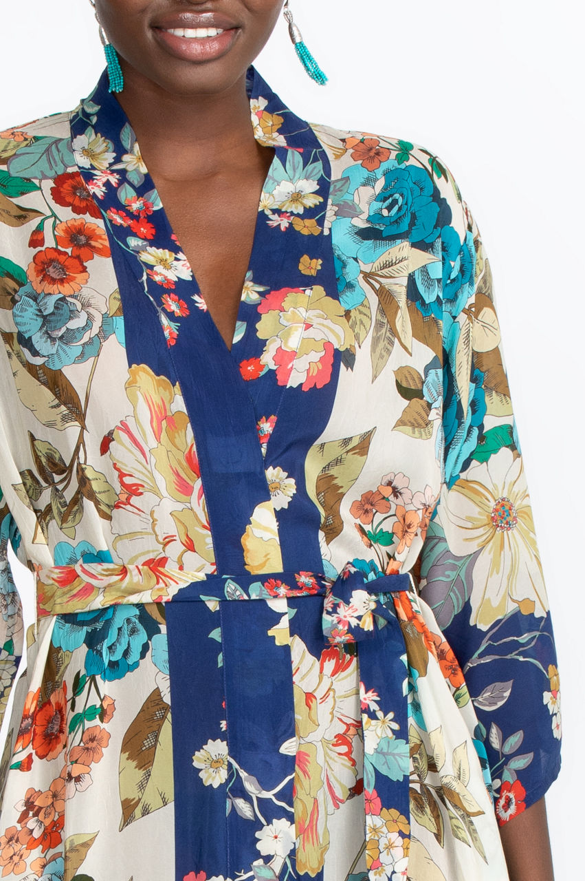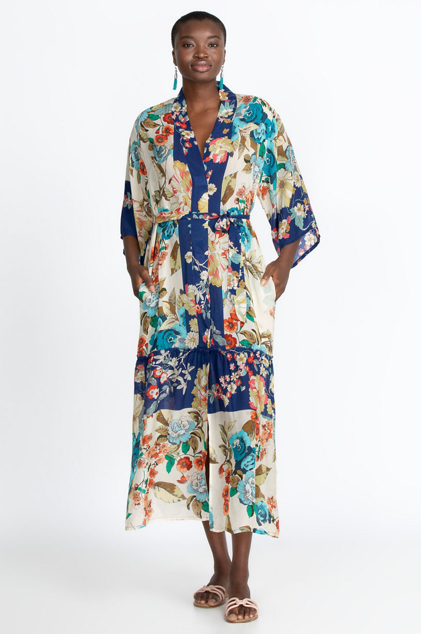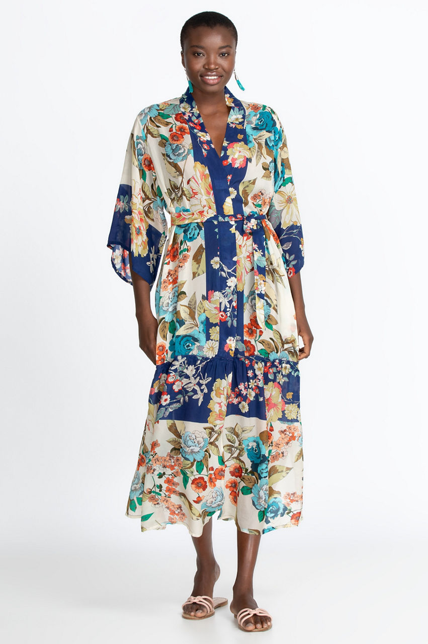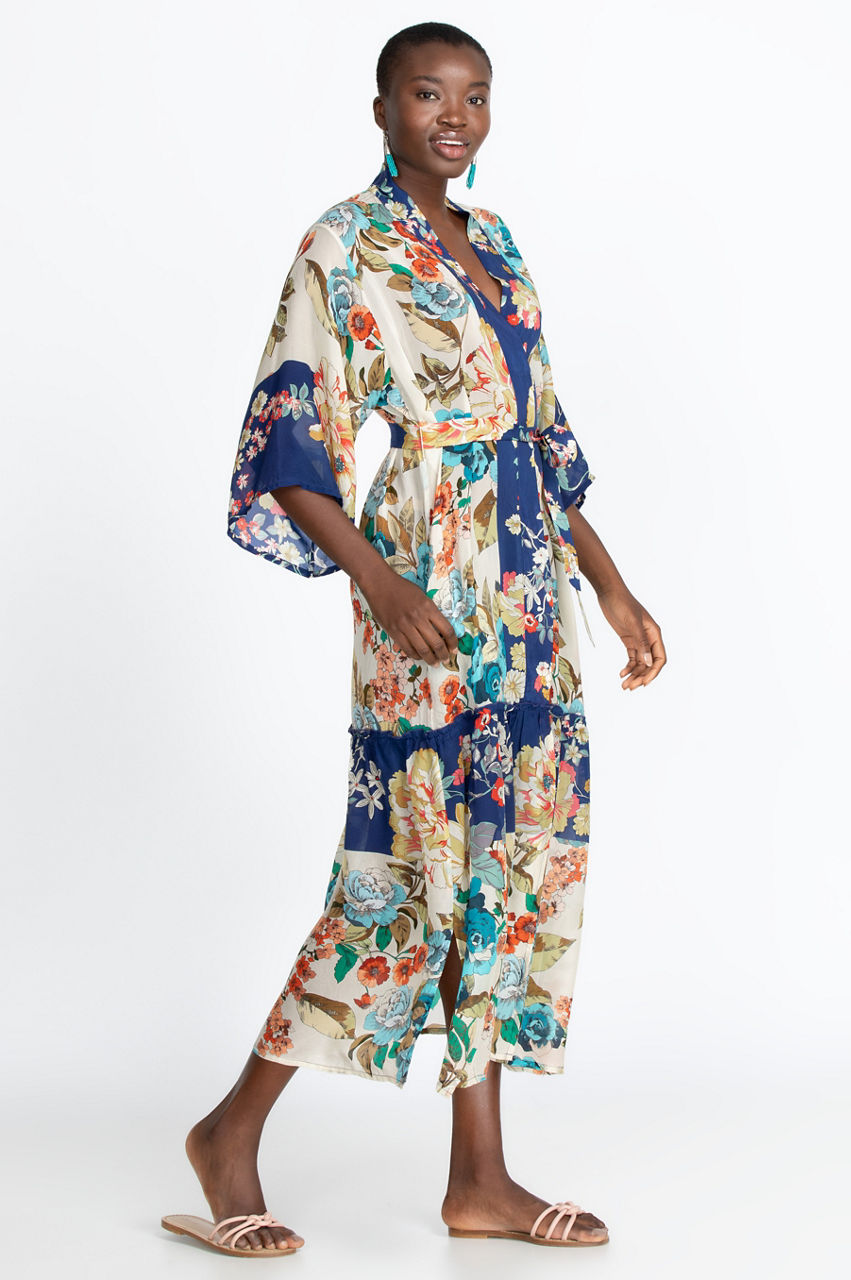 This piece takes inspiration from traditional kimonos and lounge robes with long hems. It s a stylish and comfortable lounge piece you ll enjoy wearing around the house with its floral motifs, darker color blocks, and flattering waist tie detail. Layer it over some leggings or sweatpants and complete this casual look with a soft cotton top.