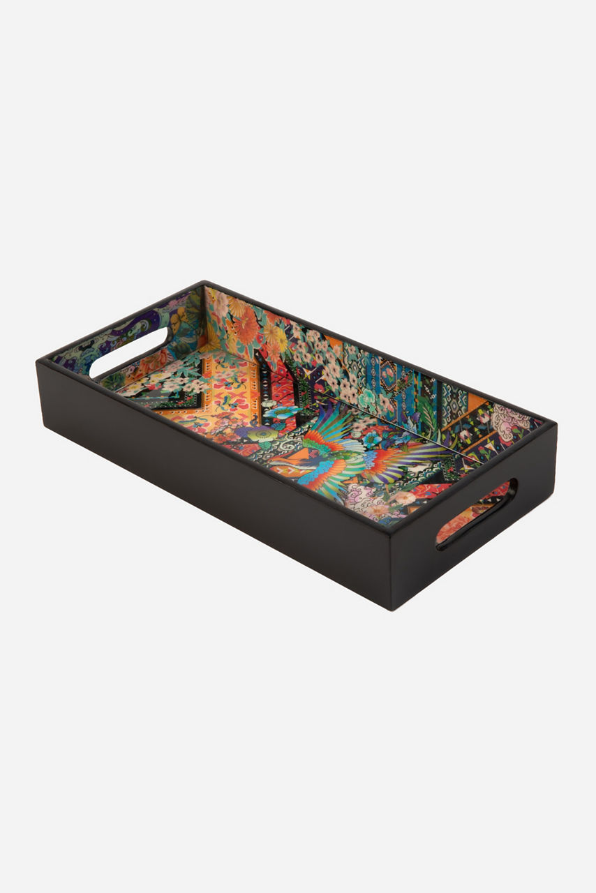 Lend a pop of color to a table or room with this bold and whimsical tray that blends varying floral patterns, centered with a mystical bird. Serve and impress guests, or use to store small items such as keys or reading materials. This one-of-a-kind tray is handcrafted by Mela Artisans with dark wood finished with lacquer ware, one of the most ancient and time-treasured Indian crafts.