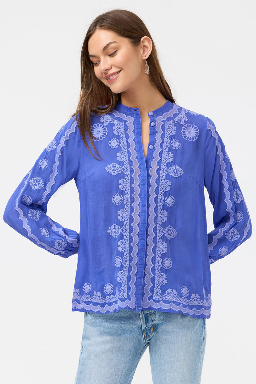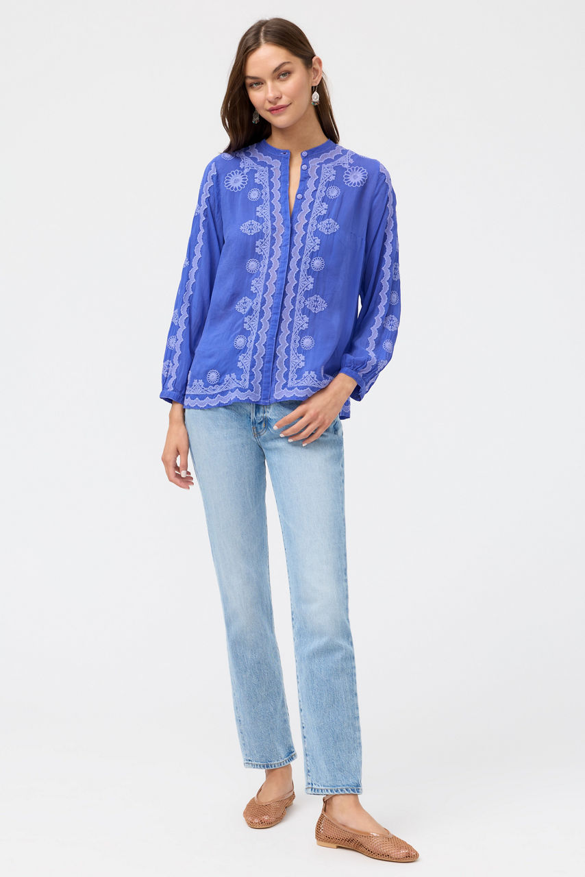 Crafted from a lightweight flowing fabric, the Endora Norma Blouse is embellished with an intricately detailed pattern throughout. Featuring a rounded neckline and long sleeves, this blouse is finished with gently puffed sleeves and a straight hemline. Pair with dark wash jeans and trendy ankle boots for a polished casual look.