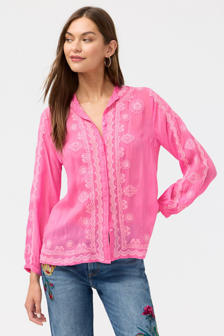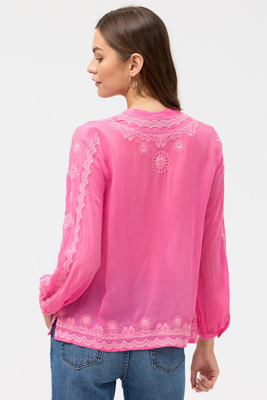 Crafted from a lightweight flowing fabric, the Endora Norma Blouse is embellished with an intricately detailed pattern throughout. Featuring a rounded neckline and long sleeves, this blouse is finished with gently puffed sleeves and a straight hemline. Pair with dark wash jeans and trendy ankle boots for a polished casual look.