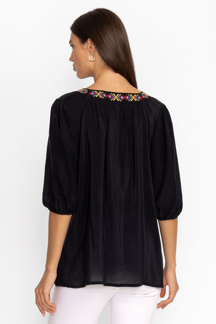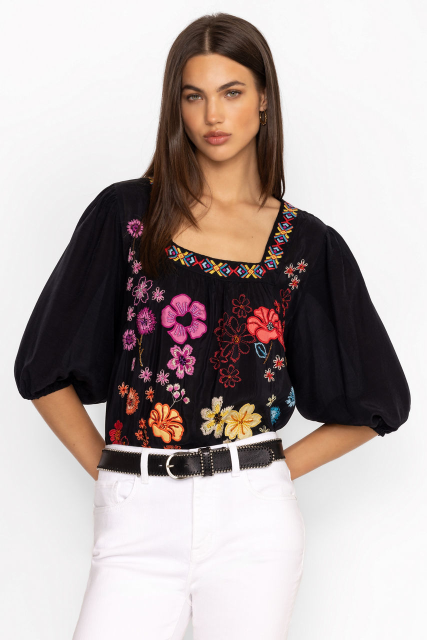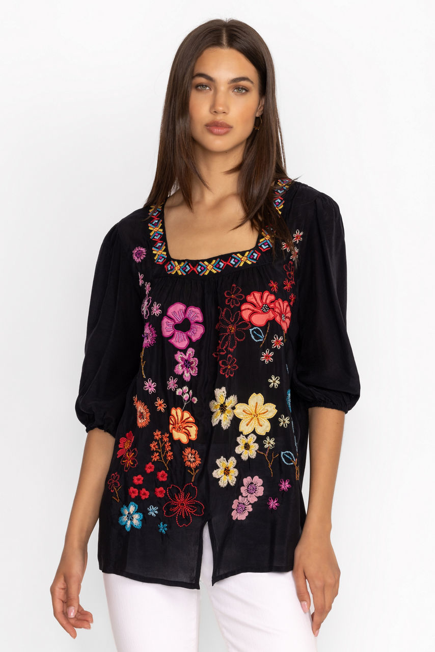 Crafted from a lightweight flowing material, the Lisbon Ennoki Blouse is adorned with splashes of brilliant color. Featuring a square gathered neckline accented with a contrasting trim, this beautiful blouse is embellished with bold placement embroidery. Pair with relaxed jeans and leather sandals for a polished casual ensemble.