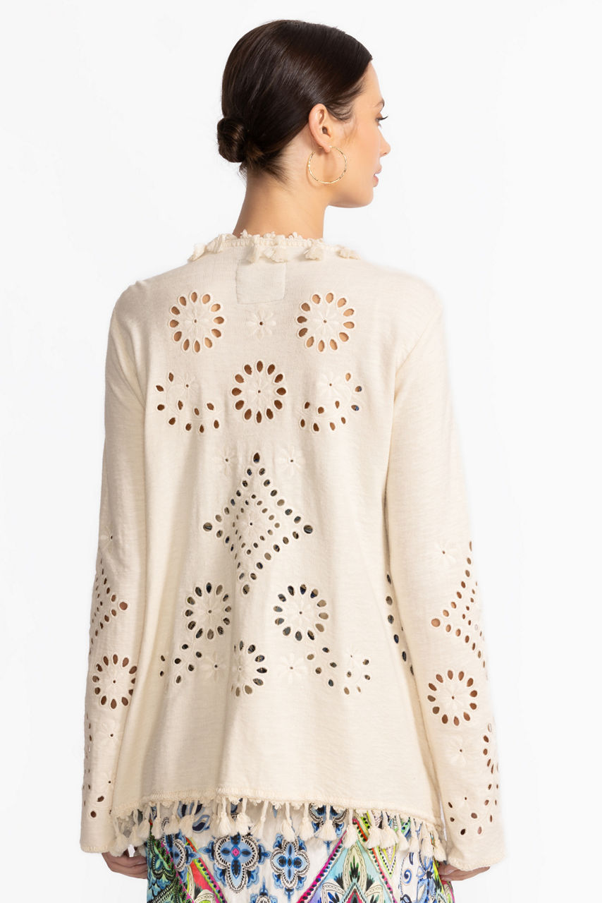 The Equette Sweater is thoughtfully crafted from rich 100% cotton creating a breathable layering piece perfect for year-round use. Featuring an elegant shawl collar and delicate eyelet cut-outs throughout, this unique sweater offers pockets and decorative tassels at the hemline. Layer over a classic tee and pair with relaxed-fit jeans for an easy casual ensemble.