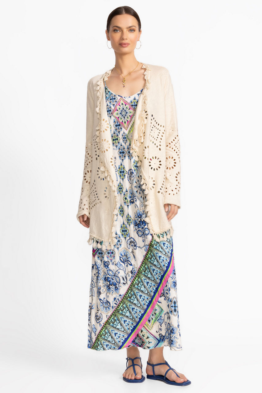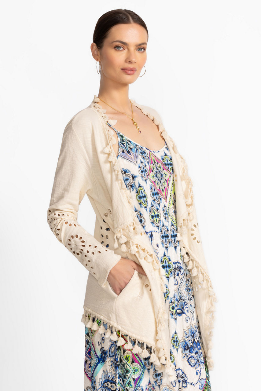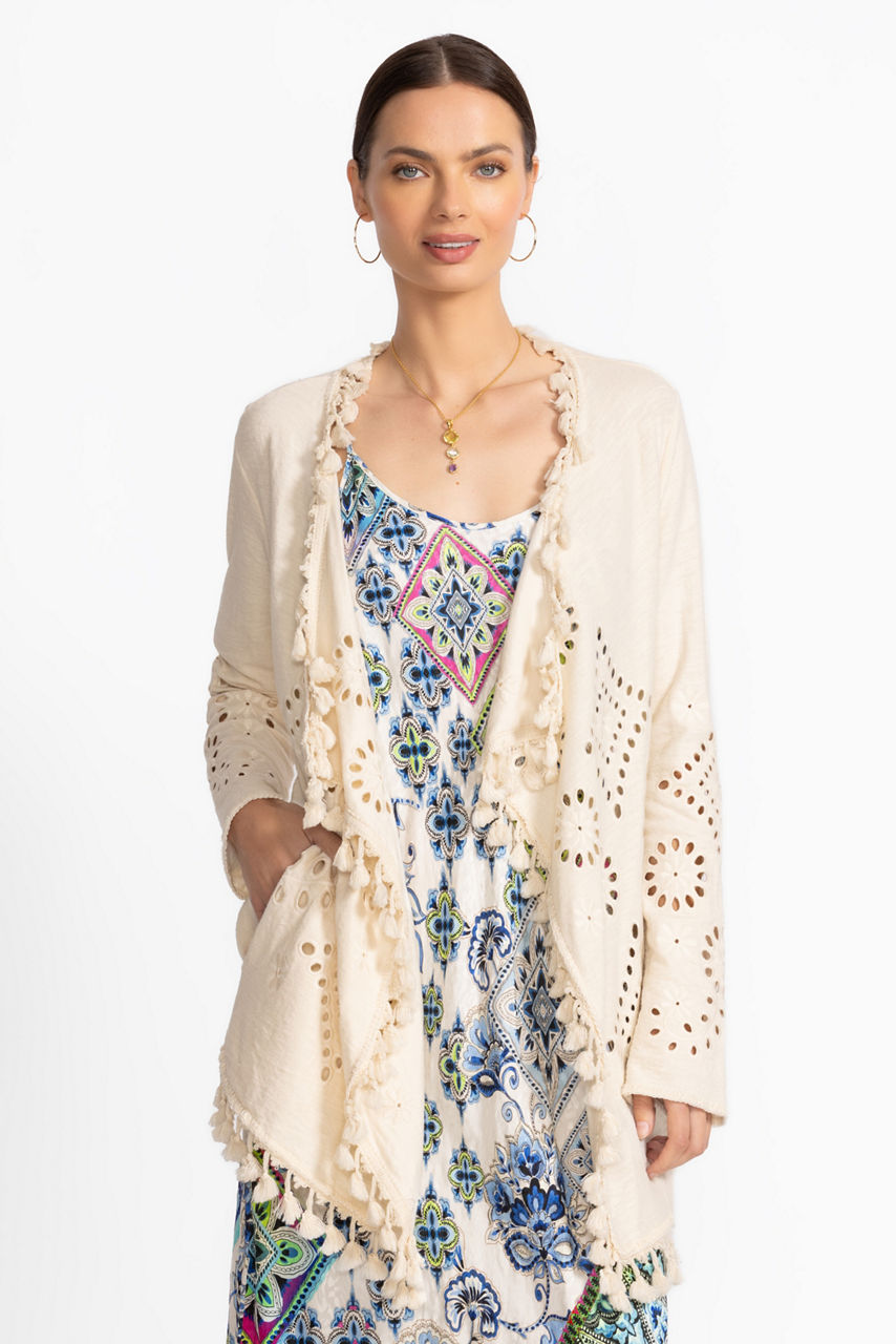 The Equette Sweater is thoughtfully crafted from rich 100% cotton creating a breathable layering piece perfect for year-round use. Featuring an elegant shawl collar and delicate eyelet cut-outs throughout, this unique sweater offers pockets and decorative tassels at the hemline. Layer over a classic tee and pair with relaxed-fit jeans for an easy casual ensemble.
