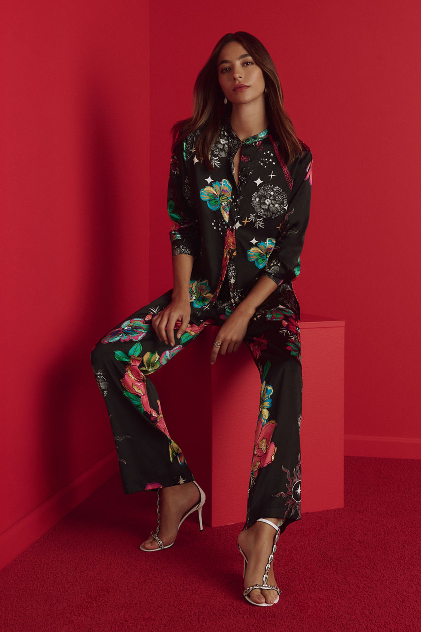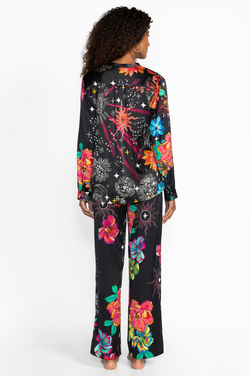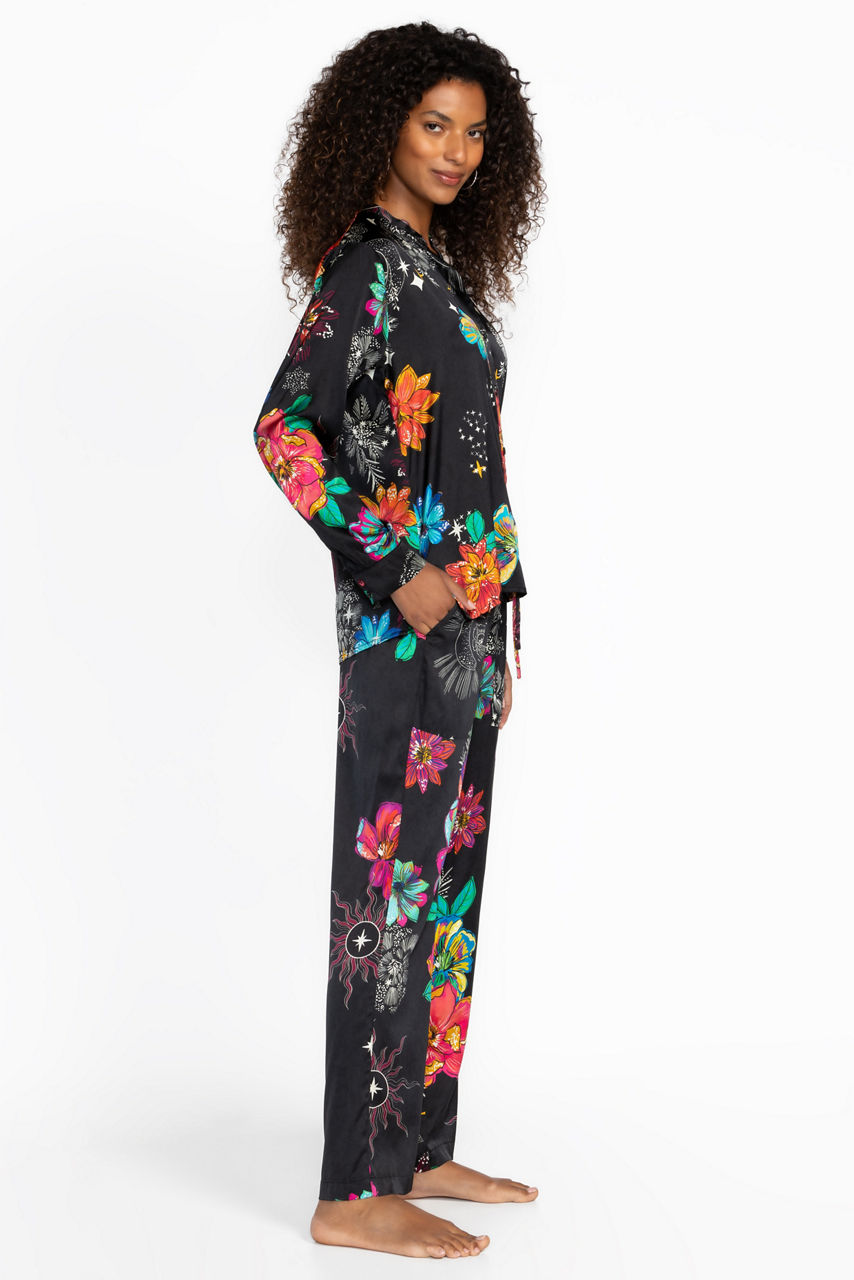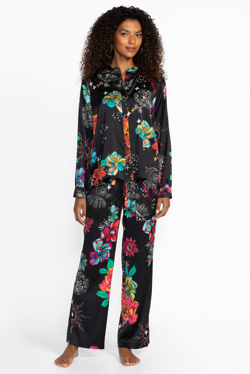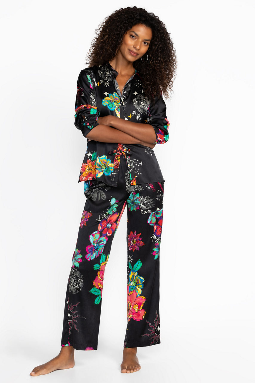 Adorned with vibrant floral bouquets, the Erik Lounge Set is crafted from a sleek silk blend. Featuring a collared button-front top with gently puffed sleeves, this set is finished with elastic waisted wide-leg pants complete with pockets. Pair with a cozy robe and coordinating slippers for a relaxing evening in.