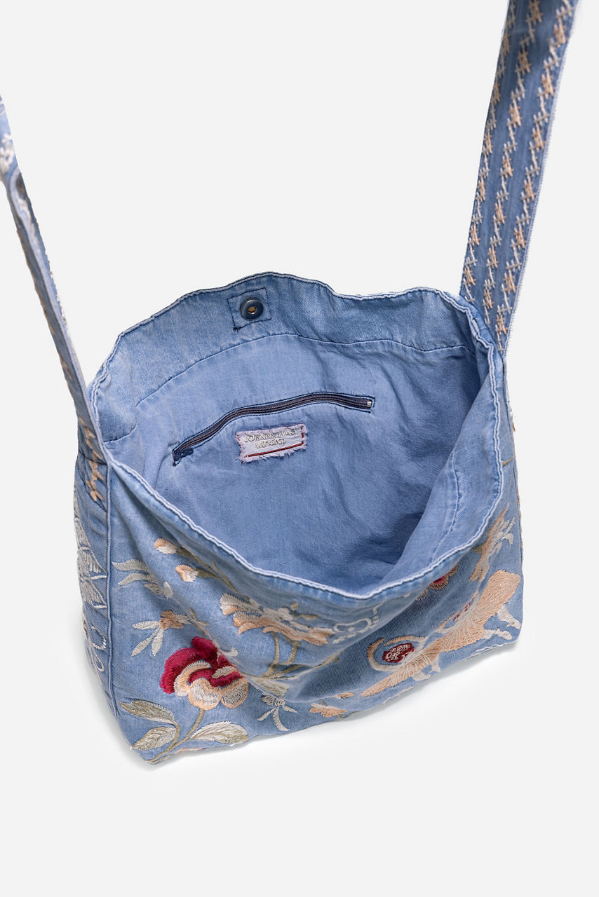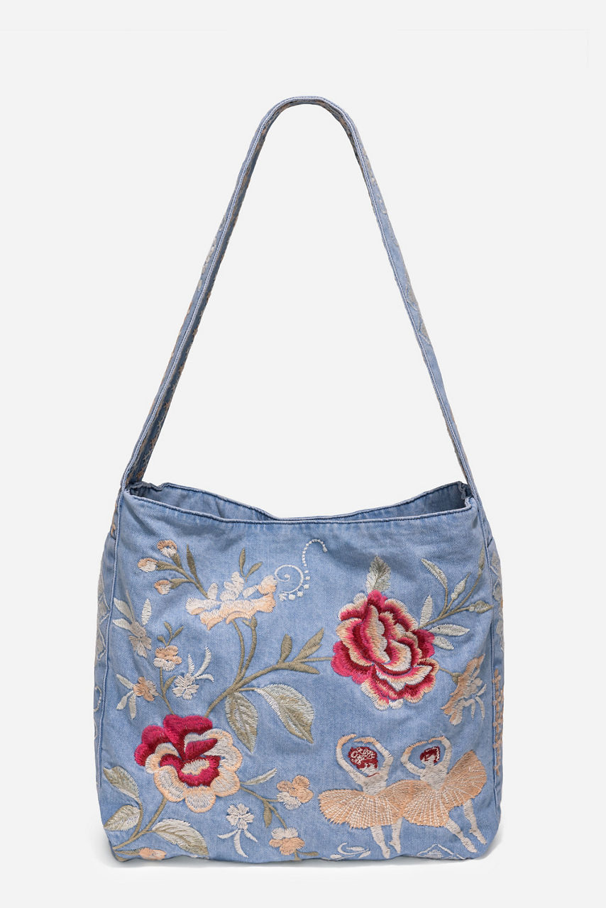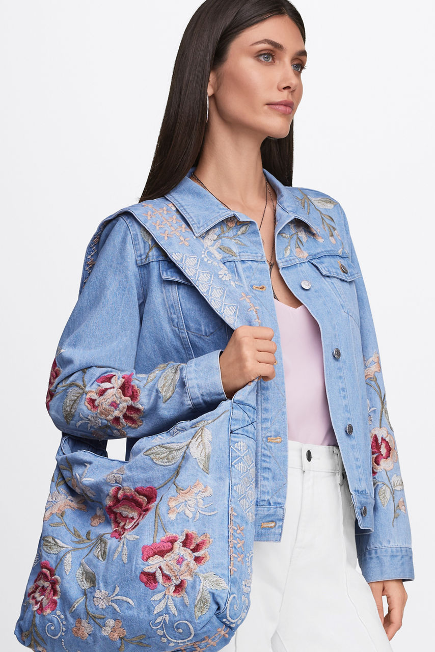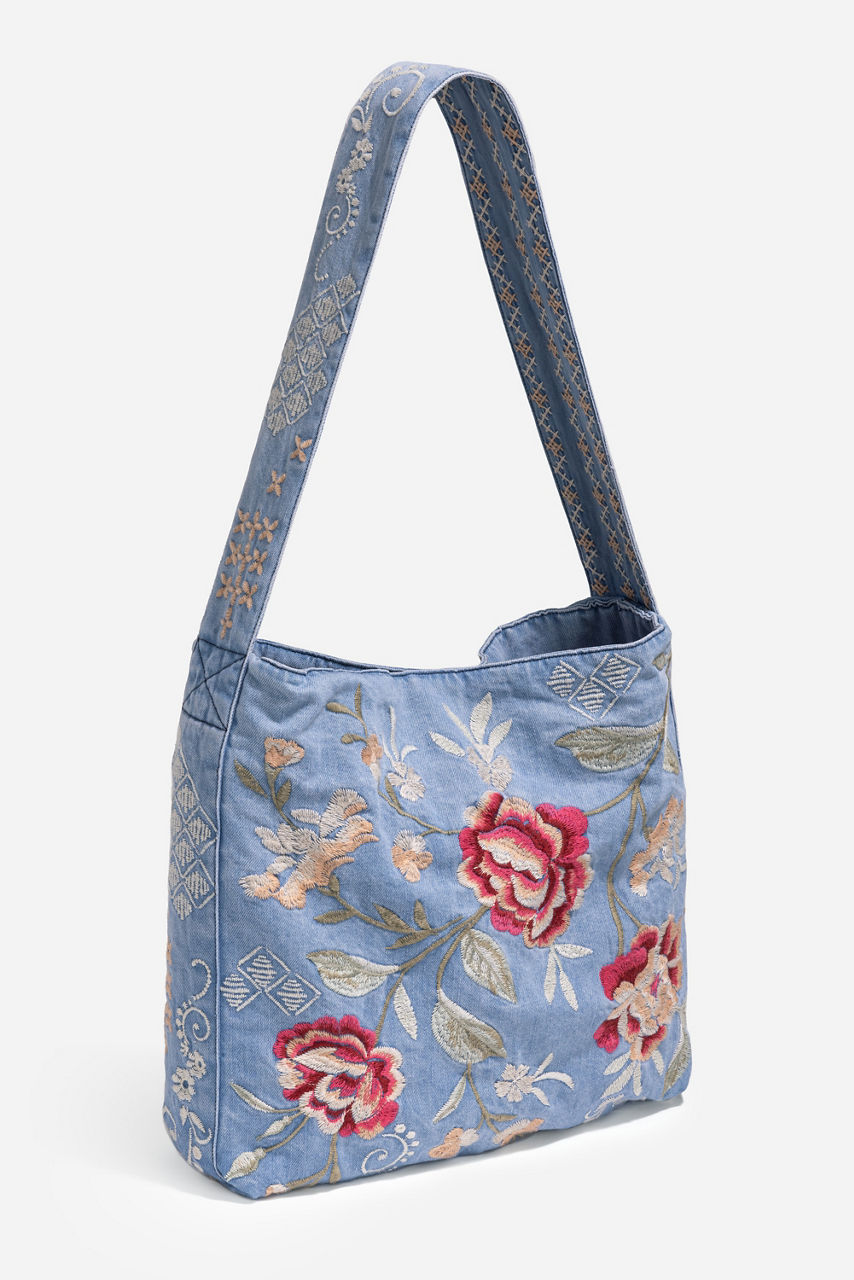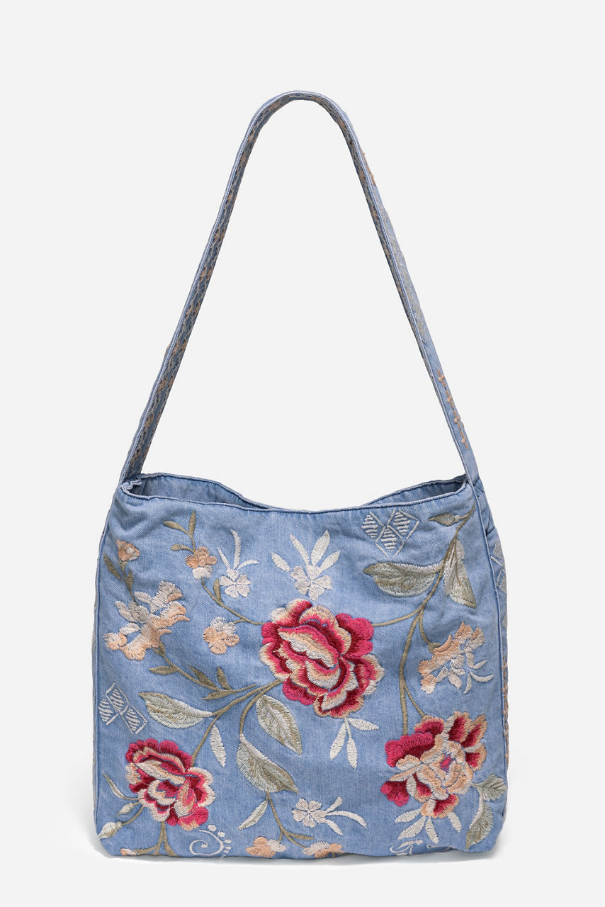Crafted from 100% cotton denim, the Erinn Wide Strap Denim Tote is perfect for daily use. Designed with an open bucket-style with a wide shoulder strap, this intricately embroidered bag is finished with bold and colorful floral embroidery. Pair with a classic tee and relaxed denim for an easy casual look.
