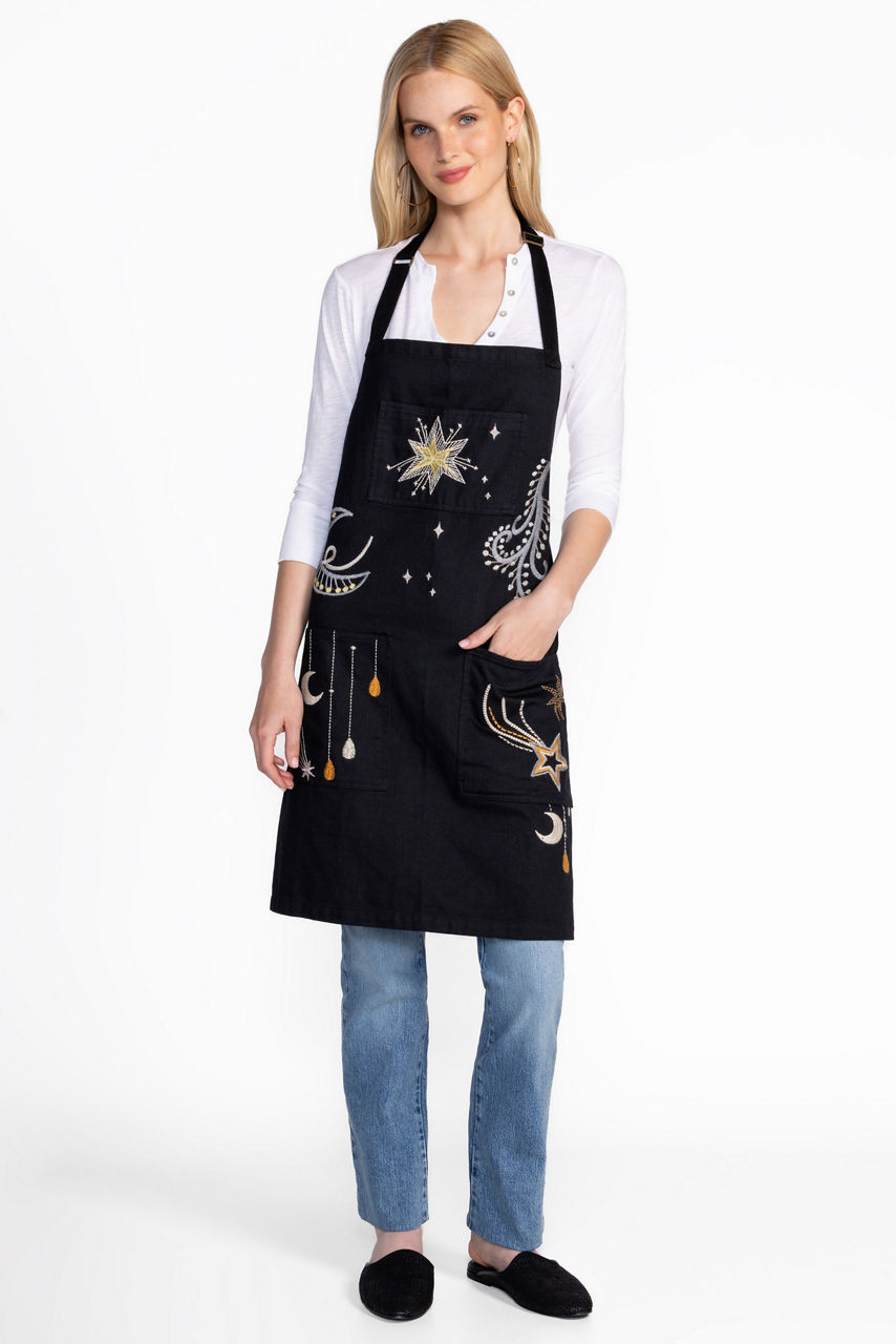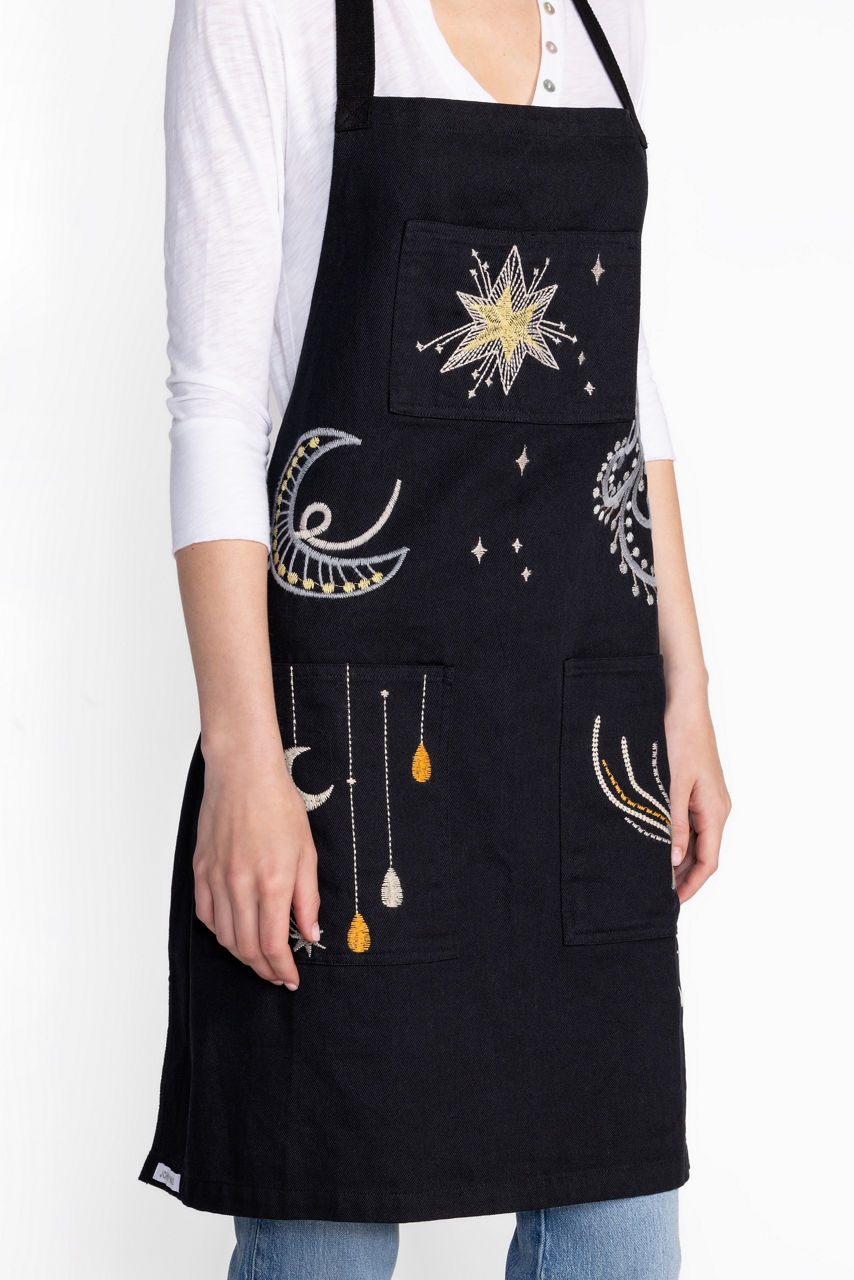 Crafted from 100% cotton, the Ethereal Apron is embellished with striking celestial iconography. Featuring an adjustable neck strap and three patch pockets, this functional apron is finished with intricate embroidered detailing for a hint of elevated style. Layer over your outfit to stay guest-ready and to avoid any spills or splashed in the kitchen.