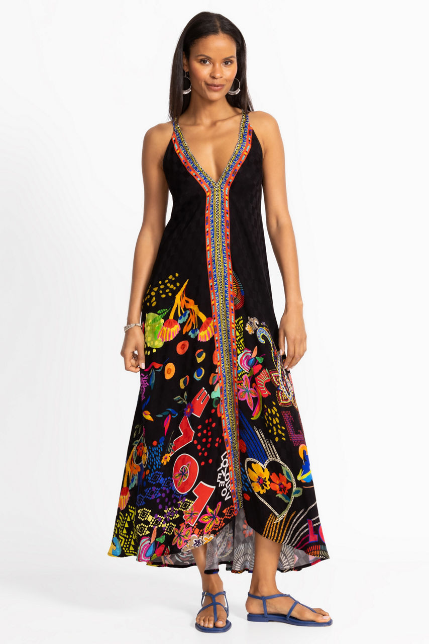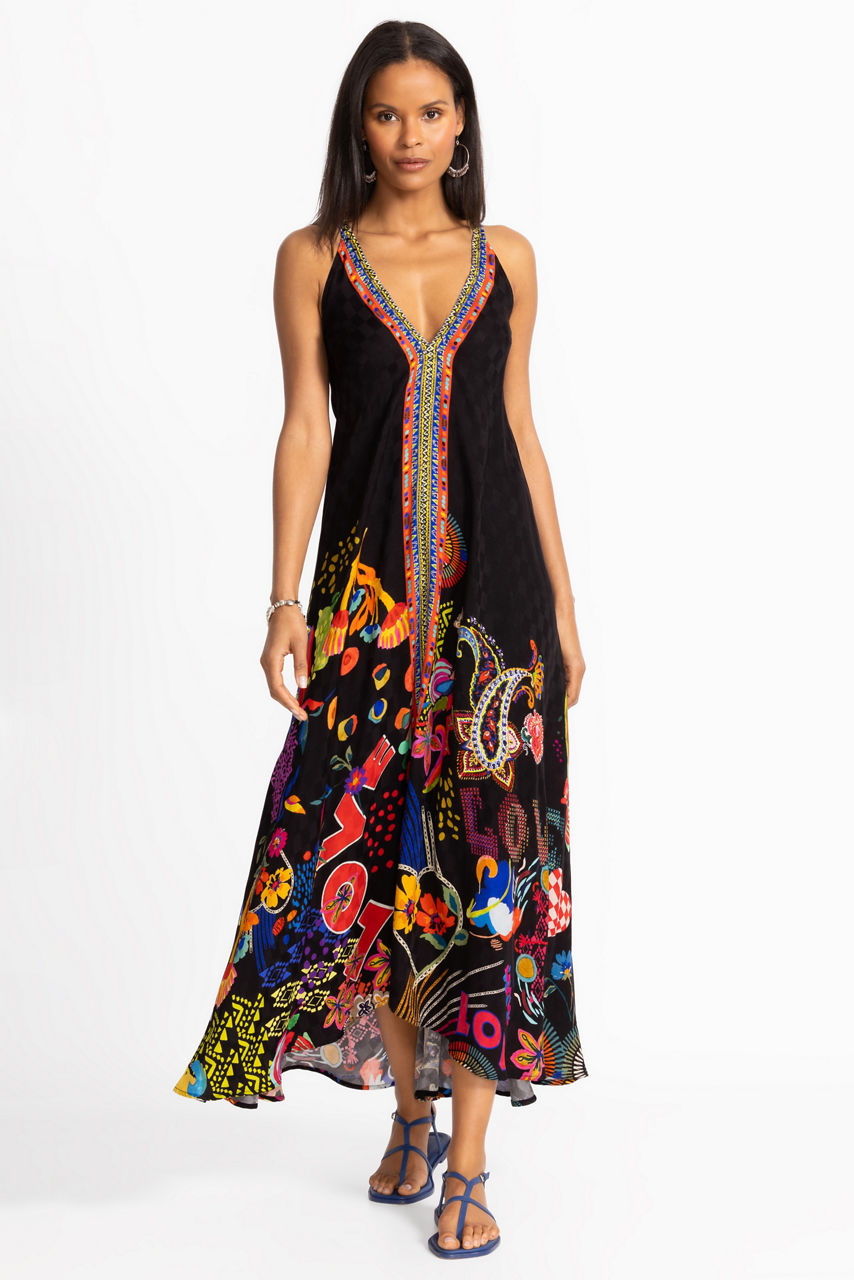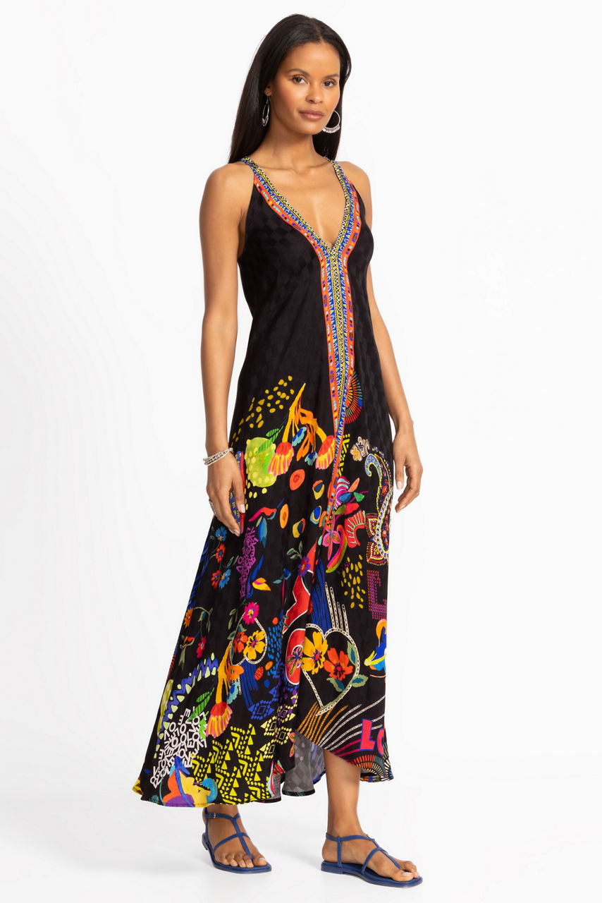 Boldly adorned with rich floral color against an inky black backdrop, the Eva Dress features a flowing feminine silhouette with an asymmetrical hem. Designed with a V-neckline embellished with sparkling rivets, this lightweight sleeveless dress is finished with a contrasting stripe at its center. Pair with strappy heels and delicate silver jewelry for a polished evening look.