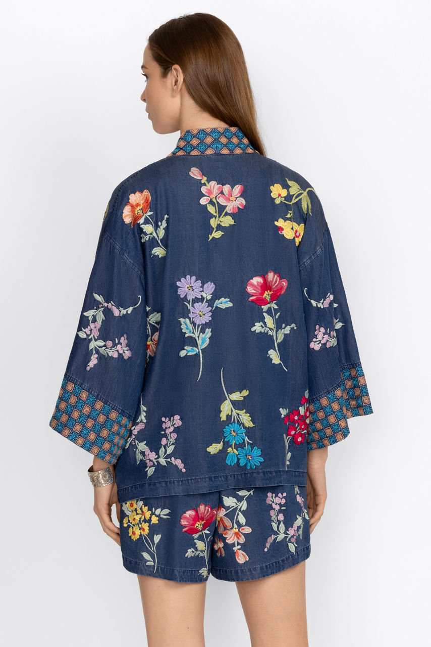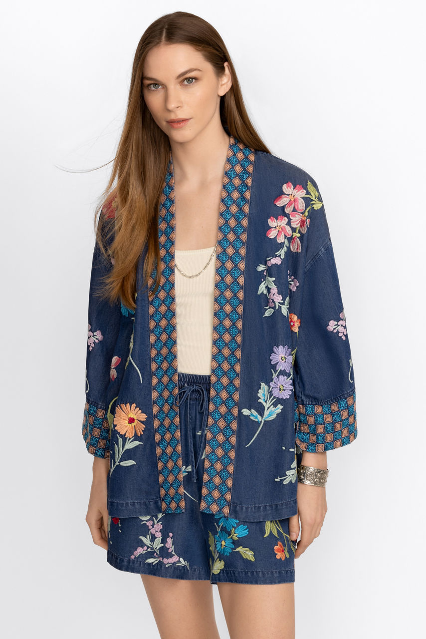 Offering a fresh take on a traditional kimono, the Evangeline Tencel Cropped Kimono is designed with a relaxed fit. Featuring an open-front neckline bordered with a contrasting print, this lightweight kimono is finished with colorful placement embroidery. Layer over a classic white tee and pair with the Evangeline Drawstring Shorts for a fresh warm weather look.