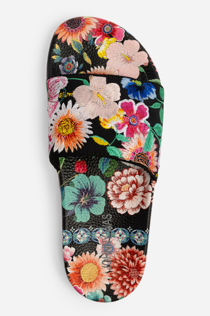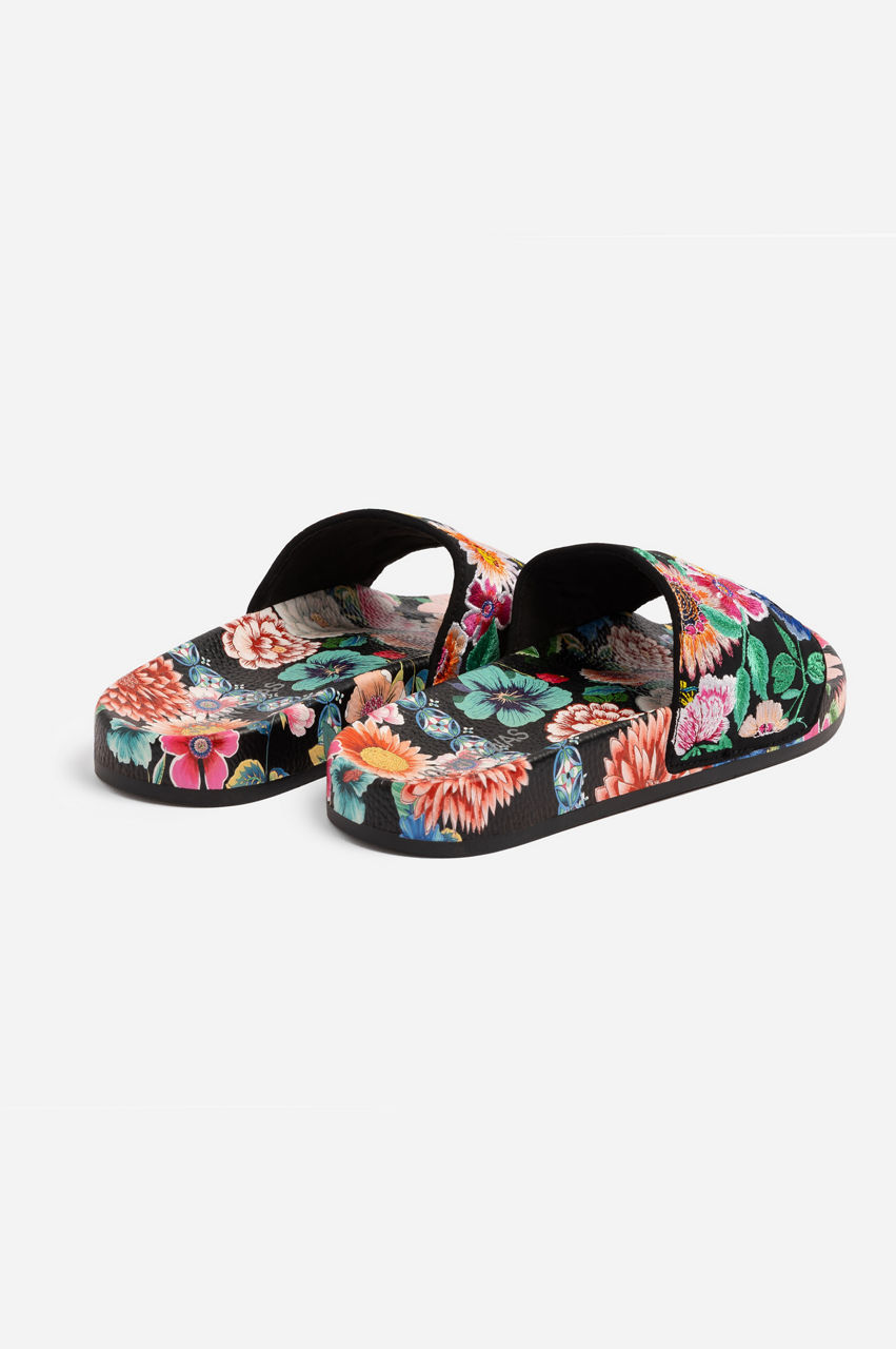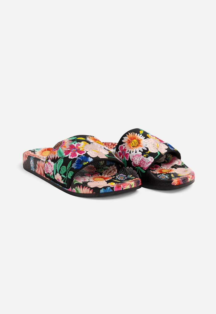 Offering a stylish option for the pool or beach, the Evening Palace Slides are the perfect way to complete your swimwear ensemble. Crafted from durable 100% rubber, these slides offer a black backdrop adorned with colorful embroidered bouquets for a feminine touch. Pair with your swimwear for an easy resort season style.